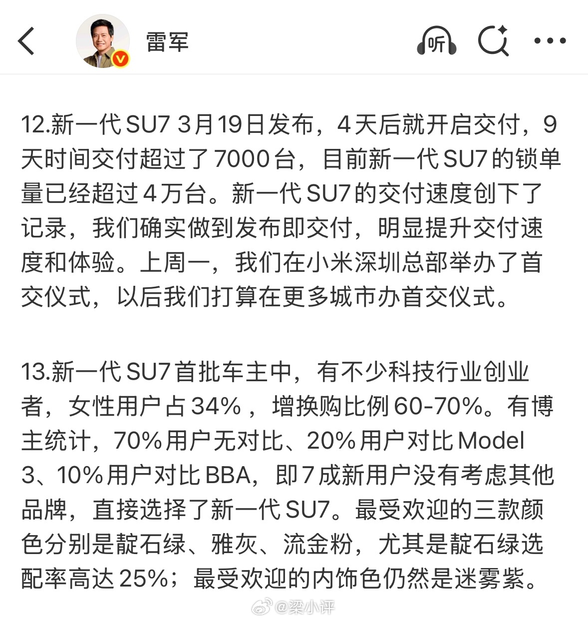 雷军回应新一代SU7锁单超4万台