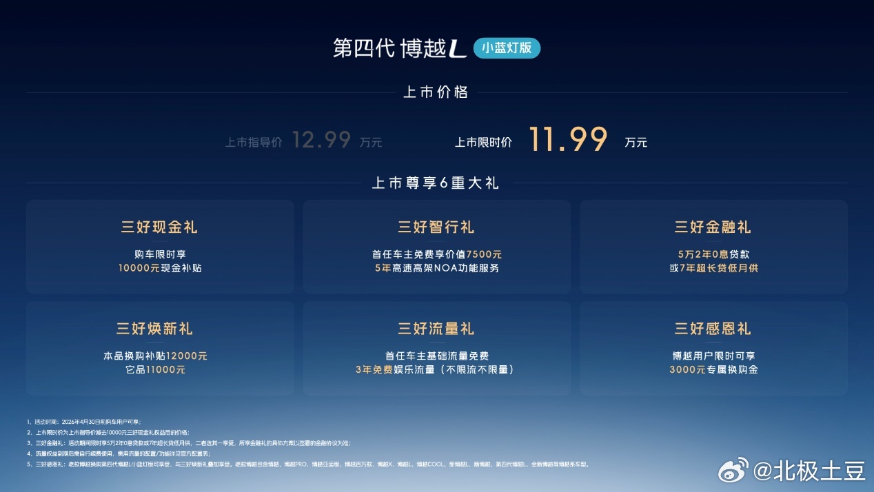 第四代博越 L 小蓝灯版正式上市,限时售价 11.99 万元。新车是 15 万内搭载千里浩瀚 H3 智驾方案的燃油 SUV,把高阶 NOA 智驾体验落到 11 万级价位。