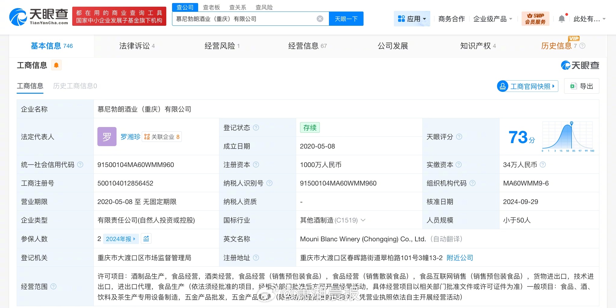 慕尼勃朗酒业(重庆)有限公司成立于2020年5月,法定代表人为罗湘珍,注册资本1000万人民币,经营范围含酒制品生产,食品经营,酒类经营,食品、酒、饮料及茶生产专用设备制造,五金产品批发等。股东信息显示,该公司由米小平、罗湘珍共同持股。