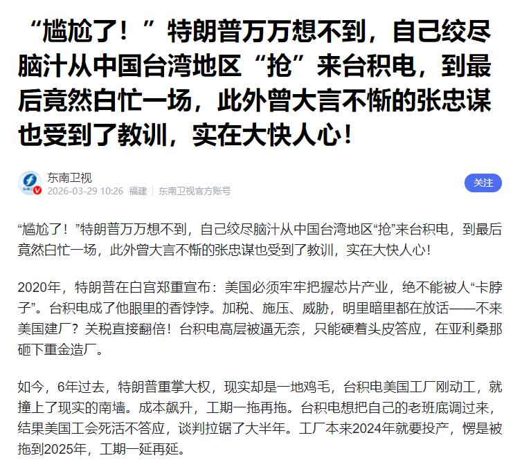 “尴尬了”特朗普万万想不到,自己绞尽脑汁从中国台湾地区“抢”来台积电,到最后竟然白忙一场,此外曾大言不惭的张忠谋也受到了教训,实在大快人心! 据媒体3月29日报道,时间拉回2020年,当时特朗普还在担任美国总统,那时候的美国,在芯片产业上已经开始有了危机感,生怕自己的科技霸权地位被动摇。 特朗普在白宫公开表态,美国必须牢牢抓住芯片产业的主动权,绝对不能被其他国家卡脖子,而当时的台积电,在全球芯片代工行业里就是妥妥的领头羊。 不管是苹果、高通这样的国际大公司,还是很多科技企业,都得依赖台积电制造高端芯片,尤其是最先进的制程技术,几乎被台积电垄断。 也正因为这样,特朗普就把目标锁定在了台积电身上,一门心思要让台积电去美国建厂。当年的白宫会议上,特朗普的态度强硬到没话说,他直接点名台积电,直言这家企业掌握着全球最先进的芯片制程,是美国芯片安全的命门,容不得有半点闪失。 在他的逻辑里,高端芯片制造这种核心技术,绝对不能掌握在海外,必须搬到美国本土,这样才能确保美国在科技领域的绝对优势,才能继续维持自己的霸权地位。 为了让台积电乖乖听话,特朗普政府一边不断施压,放出狠话,暗示如果台积电不配合,就会采取关税等制裁措施,一边又开出了看似优厚的条件,承诺给予补贴和政策支持。 面对这样的软硬兼施,台积电最终还是妥协了,在2020年5月正式宣布,将投资120亿美元,在美国亚利桑那州凤凰城兴建一座5纳米晶圆厂。 消息一经公布,特朗普政府就大肆宣扬,到处吹嘘这是“美国制造业回归”的伟大胜利,是确保美国科技霸权的关键一步,特朗普本人也多次在公开场合炫耀自己的“成果”,仿佛已经牢牢握住了芯片产业的主动权。 可谁也没想到,这场看似风光的“抢厂”行动,到最后竟然成了一场彻头彻尾的笑话。特朗普原本以为,只要把台积电的工厂搬到美国,就能轻松掌握高端芯片技术,实现美国芯片产业的自主,可他忽略了芯片产业的复杂性,不是简单建一座工厂就能成功的。 台积电在美国的工厂,从一开始就问题不断,先是投资成本一路飙升,原本计划120亿美元的投资,后来不断追加,到最后总投资额竟然达到了1650亿美元,远超最初的预期。 更麻烦的是,美国本土缺乏芯片产业完整的供应链和专业人才,为了支撑美国工厂的运营,台积电不得不从中国台湾地区总部抽调超过2000名核心工程师赴美,这不仅让台湾地区的研发力量受到影响,也让美国工厂的运营成本大幅增加。 要知道,美国亚利桑那州的工业用电价格是中国台湾地区的3倍,当地工程师的薪资水平也比台湾高出47%。 再加上很多制造芯片所需的关键化学材料,美国本土无法稳定供应,需要从中国台湾、日本等地空运,这些都让台积电美国工厂的运营举步维艰。 按照最初的计划,台积电美国5纳米晶圆厂原定2024年投产,可直到现在,工厂还没能完成设备调试,量产时间一推再推,3纳米产线的量产时间更是从2026年推迟到了2028年。 更尴尬的是,台积电美国工厂的亏损一直在持续,根据台积电2024年的股东会年报显示,美国亚利桑那新厂去年亏损新台币近143亿,约合人民币32亿元,过去四年累计亏损更是超过新台币394亿,相当于人民币12亿美元。 而曾经在这件事上大言不惭的张忠谋,也受到了实实在在的教训。当初台积电决定赴美建厂时,张忠谋曾公开表态,认为赴美建厂是正确的选择,能够帮助台积电拓展海外市场,可现实狠狠打了他的脸。 随着美国工厂持续亏损、量产推迟,台积电的整体毛利率被拉低,公司的发展也受到了影响,张忠谋当初的言论也被网友翻出来吐槽,曾经的行业大佬,如今也陷入了尴尬的境地。 更值得一提的是,特朗普后来再次当选美国总统后,不仅没有给台积电提供更多支持,反而变本加厉地施压,要求台积电进一步扩大在美投资,否则就对其输美芯片征收100%的关税。 这让台积电陷入了进退两难的境地,继续追加投资,就需要持续抽调台湾地区的工程师,动摇本土研发根基;若放缓建设步伐,又会面临美国政府的违约追责,可谓是腹背受敌。 特朗普当初绞尽脑汁“抢”来台积电,本想借此巩固美国的科技霸权,没想到最后不仅没能实现目标,反而让台积电陷入困局,自己也落得个白忙一场的尴尬结局。而张忠谋当初的盲目乐观,也让他付出了相应的代价,这一切,都是他们自己的选择所导致的。