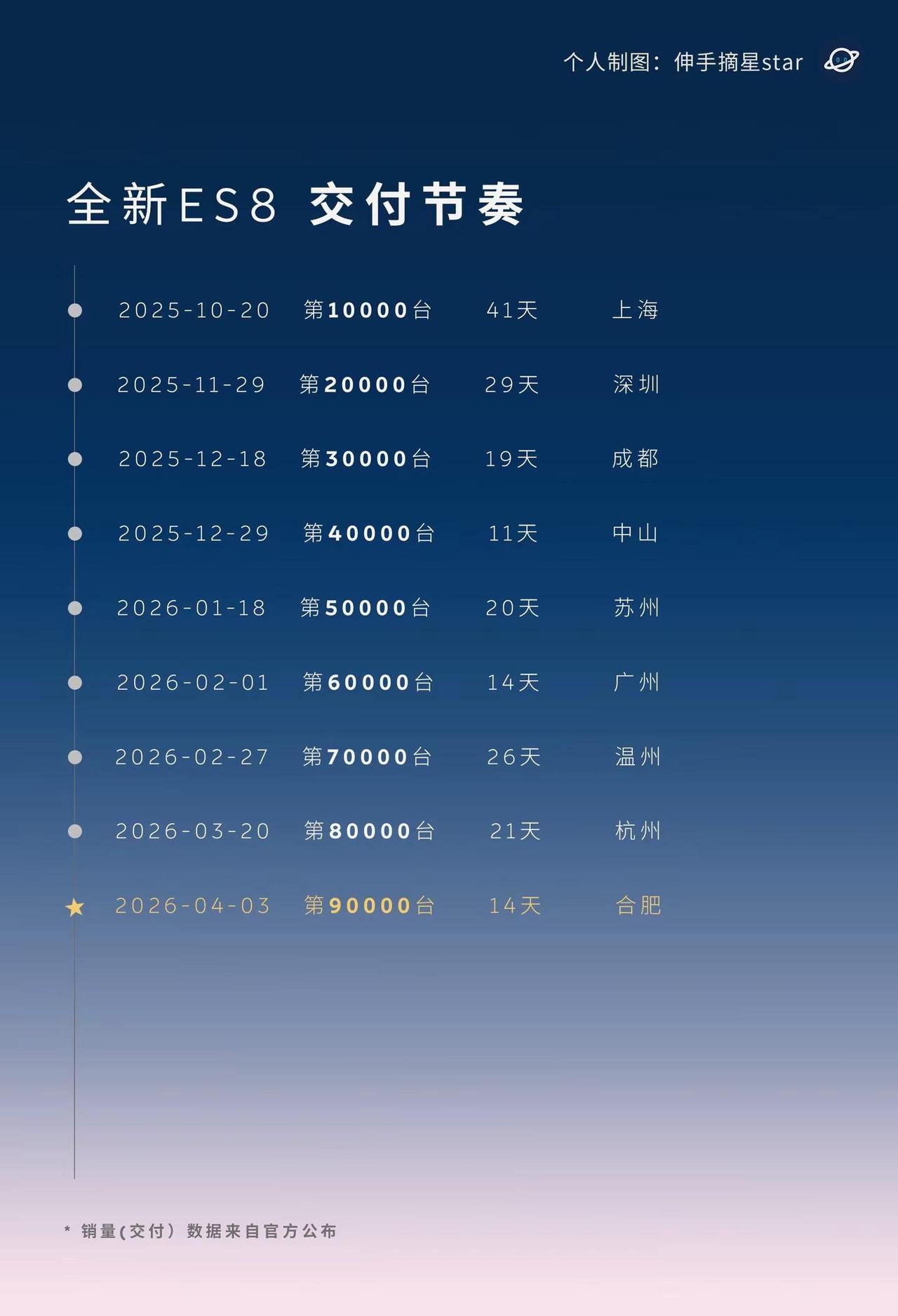蔚来ES8确实有点强!同级已经没有对手!太强了!蔚来全新ES8这是持续起飞的节奏。开启交付195天,交付破9万!不仅创下半年来最快交付纪录,继续保持高标准的交付“倍速模式”——14天交付1万台!这速度,隔壁桌都馋哭了。现在的ES8就是行走的“六边形战士”,没有短板就是它最大的长处。买大6座SUV,根本绕不过ES8.连续3个月蝉联大型SUV&40万以上车型,月销量冠军。月销破万已成常态,10万台里程碑就在眼前。这波ES8“蔚来速度”,我愿称之为王者归来,高端纯电市场的标杆模范!你蔚还是你蔚,继续加电。蔚来全新es8 蔚来 新能源汽车