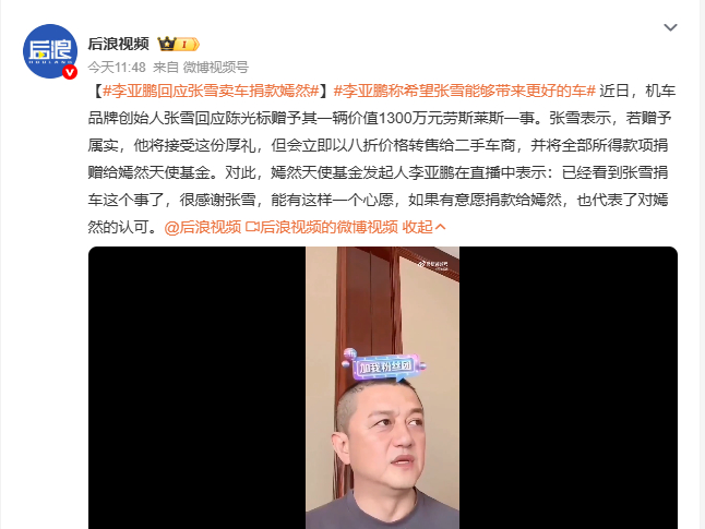 李亚鹏回应张雪卖车捐款嫣然 机车品牌创始人张雪针对陈光标赠予1300万元劳斯莱斯一事称,若属实将接受并八折转售,款项捐给嫣然天使基金。对此,嫣然天使基金发起人李亚鹏在直播中表示,看到张雪捐车举动,心怀感激,认为其捐款是对嫣然工作的肯定。