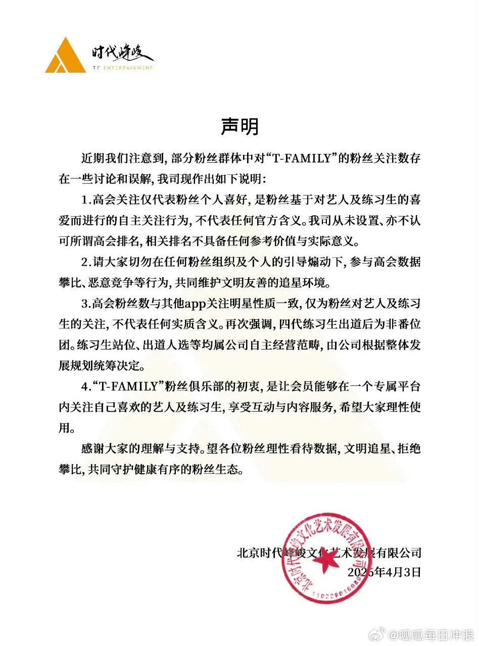 时代峰峻就高会排名问题发声明:高会排名不具备任何实际意义,并强调四代非番位团,练习生站位、出道人选由公司整体统筹规划决定。 高会排名居然没意义