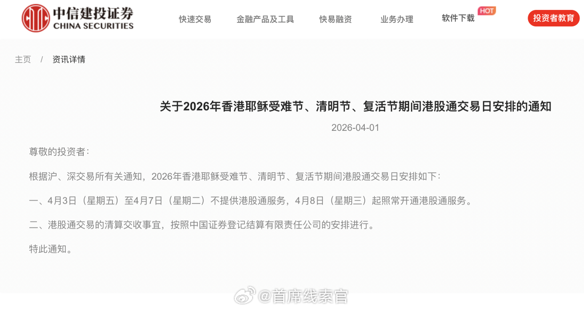 2026年香港耶稣受难节、清明节、复活节期间港股通交易日安排如下: