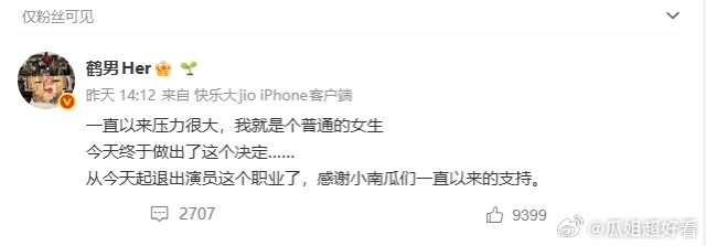 鹤男愚人节当天粉见发文表示一直以来压力很大,自己只是普通女生,从今天起退出演员这个职业,几分钟后还在评论区说到停更了,三小时后才补充自己只是愚人节想逗一下粉丝。这是不是粉丝看到都会先震惊一下吧,本质还是糊花,换个xfxy体质的流量花早就上热搜被大审判了。鹤男签了👖,下一部在聊《攻玉》,男主基本确定是侯明昊,一直以来都是定男选女的项目。不过虽然鹤男是目前意向比较大的那一位,但是几方团队都还在争取,没到最后都有变动的可能,并且好几家都想促成二搭。