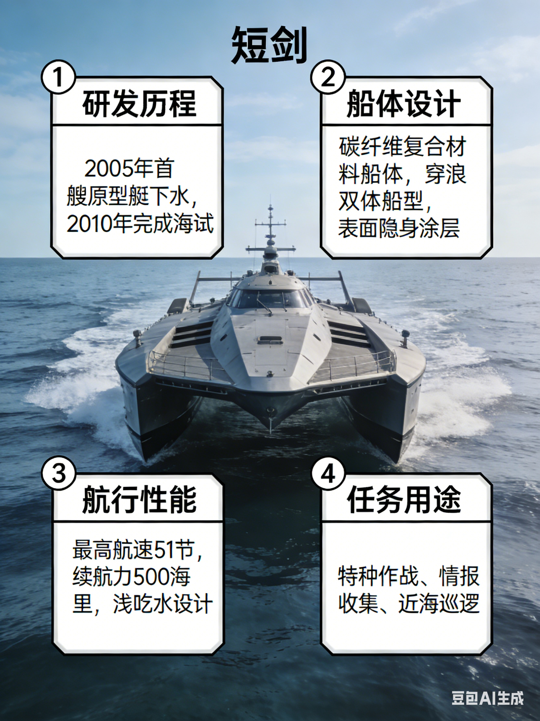 “短剑”(Stiletto)快艇是美国海军于21世纪初研制的一种高速隐形快艇,主要用于特种作战。