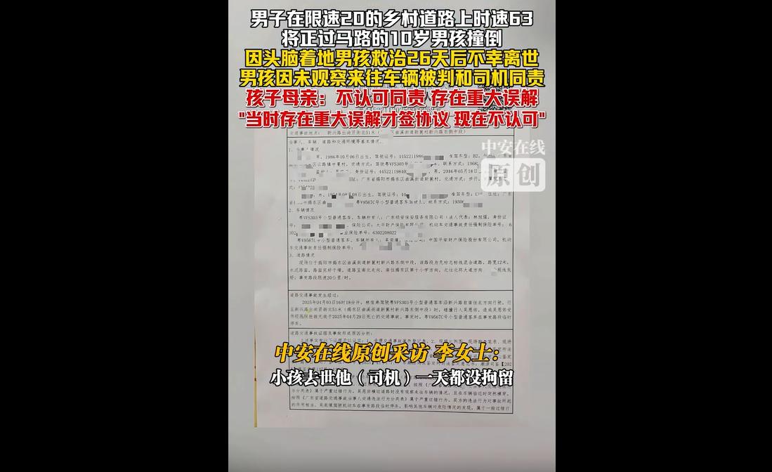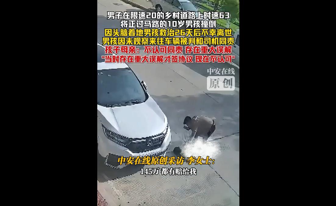 近日,广东一名10岁男孩在限速20km/h的乡村道路上过马路时,被时速63km/h的车辆撞倒,救治26天后离世。 交警判定男孩与司机同责,孩子母亲称因误解签赔偿协议,不认可该结果,145万赔偿已赔付。 首先,最令人揪心的,是一个鲜活生命的逝去。10岁,本是无忧无虑、肆意生长的年纪,却在过马路时遭遇飞来横祸,历经26天的救治仍未能挽回生命,这份伤痛,对任何一个家庭而言,都是毁灭性的打击。 孩子母亲承认孩子有跑的行为,却不认可同责判定,这份不甘与执念,藏着丧子之痛的绝望,也藏着对孩子的无尽思念,每一个为人父母者,都能共情这份锥心之痛,理解她对责任认定的质疑。 从事故本身来看,司机的过错显而易见。 乡村道路限速20km/h,而司机时速高达63km/h,属于严重超速,无视交通规则,漠视道路上的生命安全,这是导致事故发生的重要原因。 而男孩过马路时未仔细观察来往车辆、有奔跑行为,确实也存在一定的安全疏忽,这也是交警判定同责的考量之一。 但很多人难以接受的是,一个10岁的孩子,认知和自我保护能力有限,与成年人的严重超速相比,这份疏忽是否该承担同等责任,成为争议的核心。 我们应理性看待交警的责任认定,交通责任判定讲究客观公正,依据双方的过错程度划分责任,并非单纯以“弱者”为由偏袒某一方。 交警提前告知家属将定同责,家属因误解签署赔偿协议,事后反悔不认可结果,这份争议的背后,既有家属情绪的难以平复,也可能有对责任认定细节的不理解。 145万赔偿虽已赔付,但对失去孩子的家庭而言,金钱无法弥补生命的空缺,唯有公平公正的责任认定,才能稍稍抚慰他们的伤痛。 这起事件,更给我们敲响了交通安全的警钟。 一方面,司机应严格遵守交通规则,尤其是在乡村道路、学校周边等区域,务必减速慢行,敬畏每一条生命,杜绝超速、分心驾驶等违法行为,从源头减少交通事故的发生。 另一方面,家长也应加强对未成年人的交通安全教育,引导孩子养成过马路观察来往车辆、不奔跑、不横穿马路的良好习惯,提高孩子的自我保护意识。