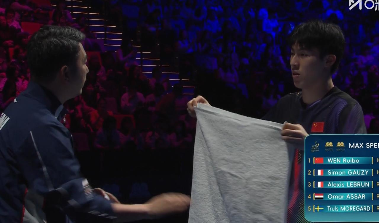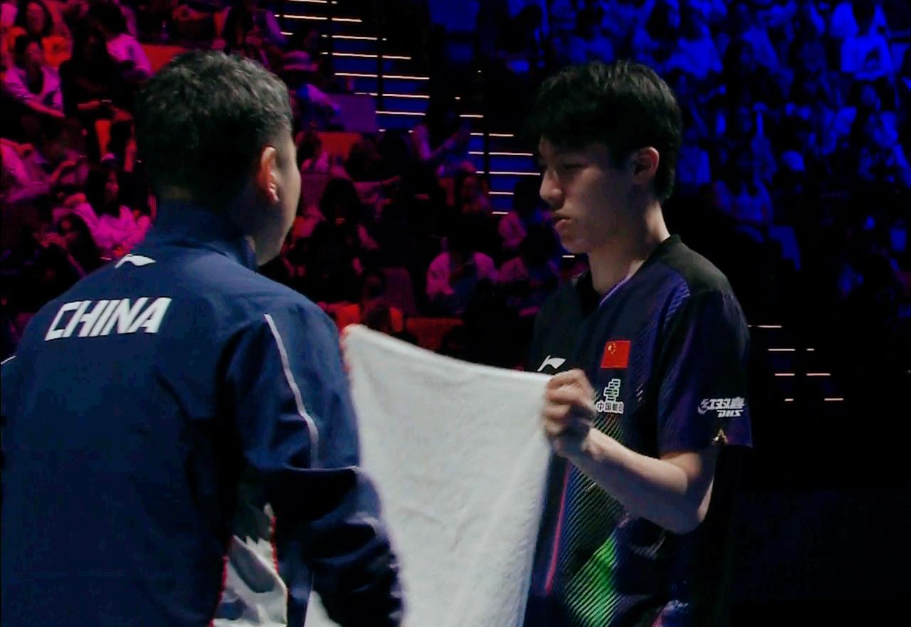 我去!刘恒指导温瑞博,又被摄像师直播了! 咱们教练指导球迷的秘密又被泄露了。 这种现场指导, 这是教练的独家秘密, 不应该直播。 刘恒说了三点, 最重要的一条是: 发球要发的更开。 否则林昀儒会直接拧拉。 第一局 林昀儒11;7拿下。 第二局 温瑞博6个发球, 5个被直接拧拉, 一个主动失误。 林昀儒8:1领先。 10:2拿到局点, 11:5拿下。