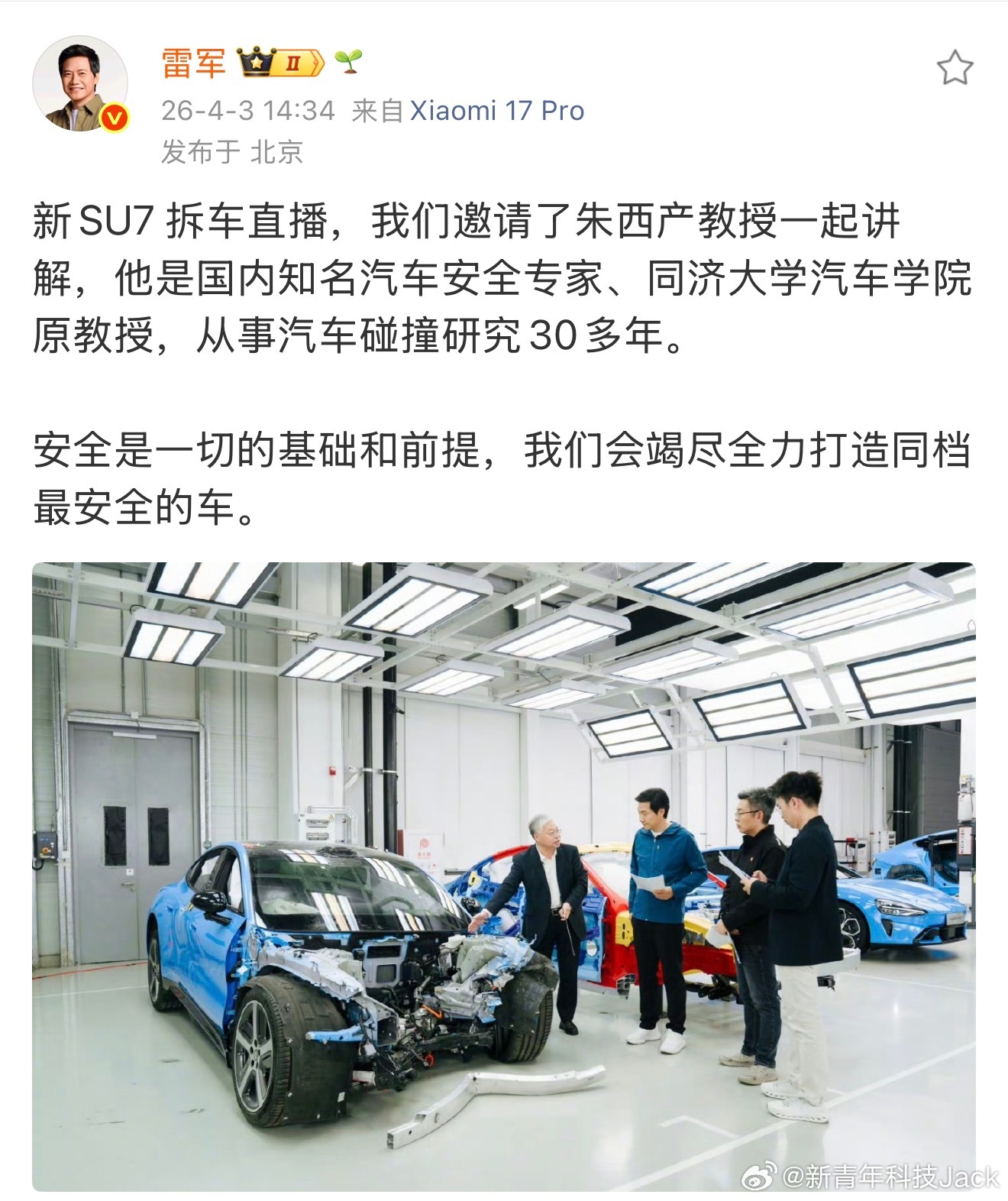 雷军称将发布装车视频期待一下后面的装车视频,估计很解压!昨天雷军直播拆车真的太细了,尤其配合白车身和碰撞测试后的实车,在整车安全上讲得很清楚,安全性和整车高质用料一目了然。