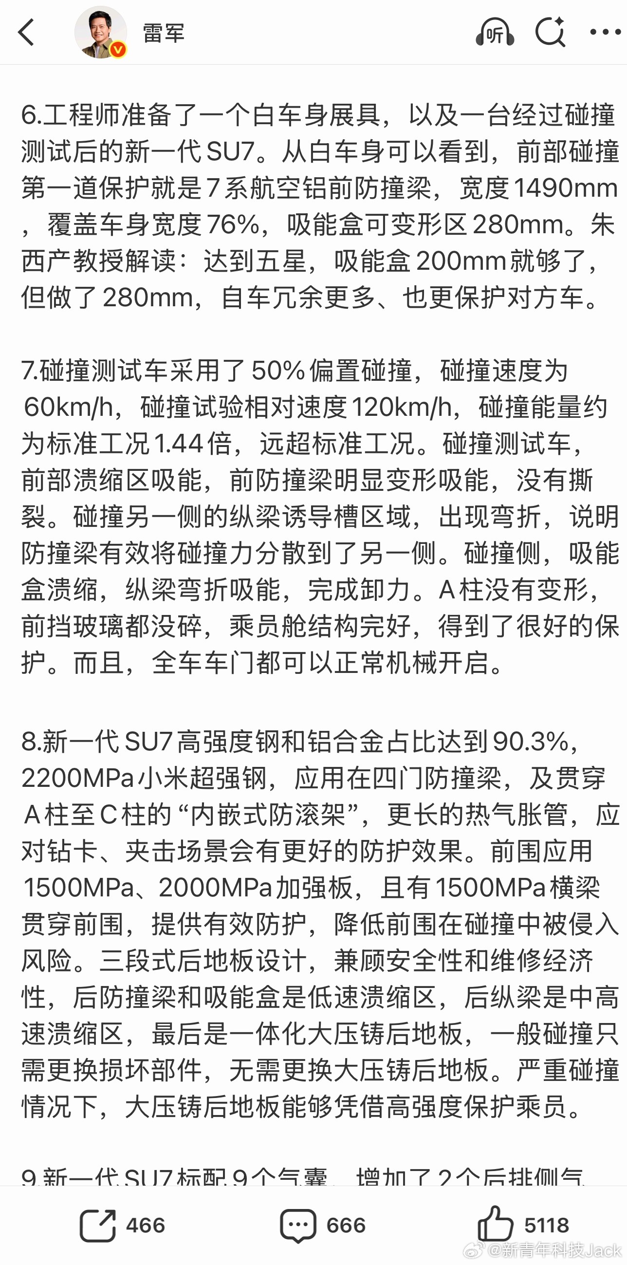 其他家车身对于高强度钢和铝合金使用在74.5%-88%之间,新SU7占比高达90.3%这用料是真的猛。昨天朱教授在直播现场看了一圈,也是对新SU7的用料和安全配置设计表示认可,新一代SU7的安全性真没得说。