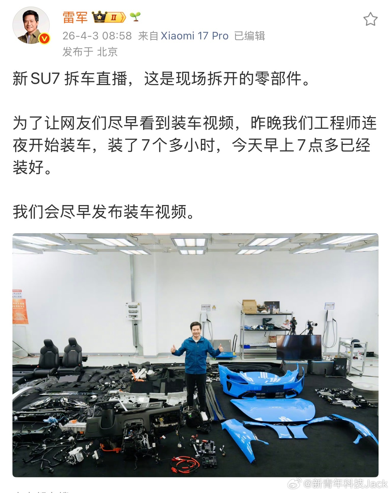 雷军称将发布装车视频期待一下后面的装车视频,估计很解压!昨天雷军直播拆车真的太细