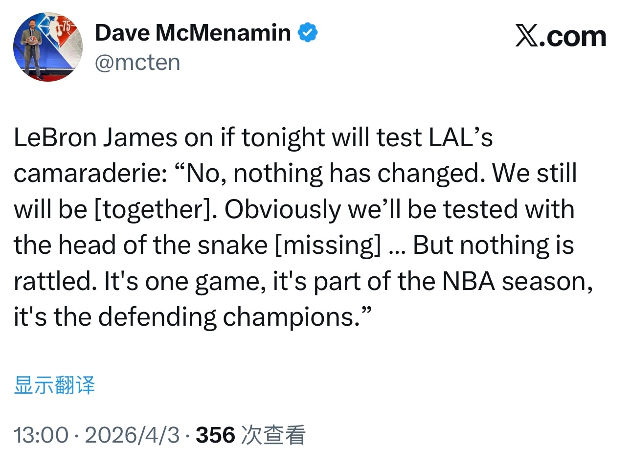 “不会,一切都没有改变,我们依旧团结一心。显然,‘蛇头’的缺阵会给我们带来考验,但球队没有任何动摇。这只是一场比赛,是赛季的一部分,对手是卫冕冠军而已。”