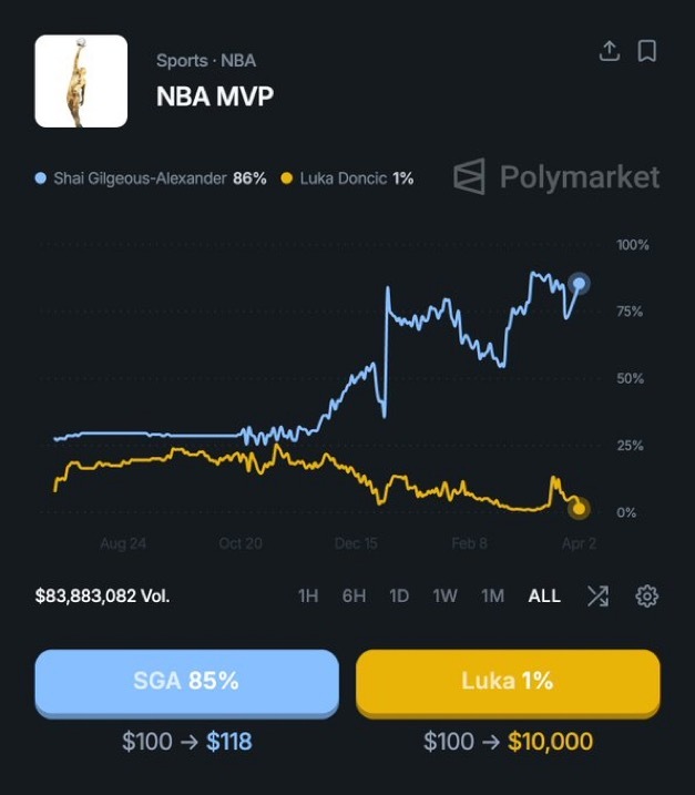 亚历山大获得MVP的概率来到86%,东契奇降至1%。