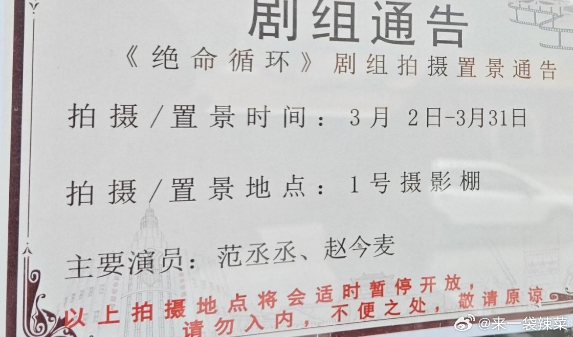 《绝命循环》开始置景了,通告显示主演是范丞丞、赵今麦