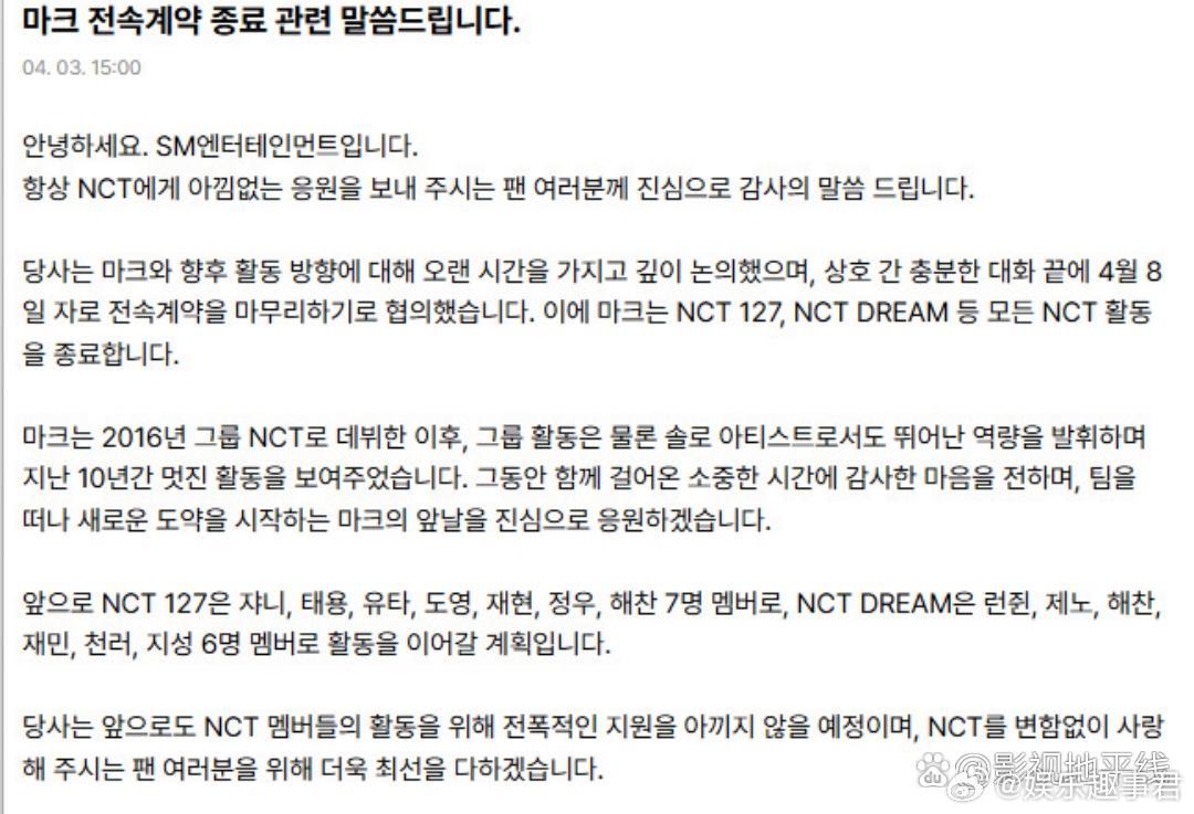 李马克解约退团4月3日,SM发布声明,称李马克将于4 月 8 日正式终止与其专属合约,退出NCT 127、NCT DREAM 在内的所有 NCT 团体活动。