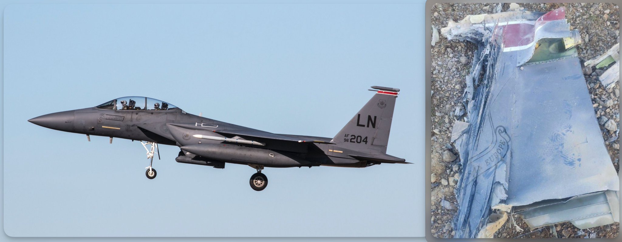 🔻其实是F-15E,494“黑豹”战斗机中队的,因为F-35尾翼上面没有红色条带,F-15E有。看下图就行。🔻第一张图是现场环境,可以确认确实是伊朗,有黑色撞击大坑,残骸稀碎了,不知道飞行员是跳伞了还是也跟着稀碎了。🔻这是第一架被证实确认USAF有人战机坠毁在伊朗境内。