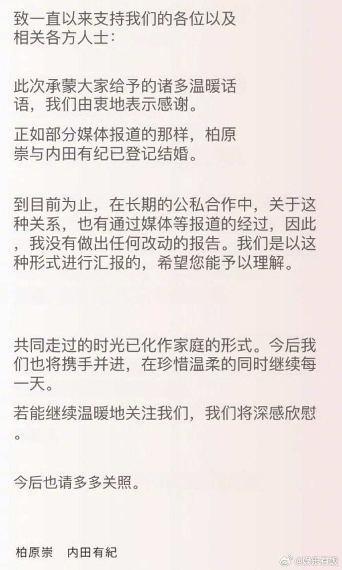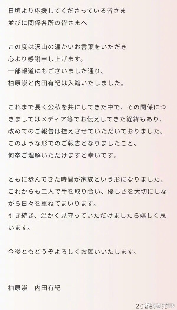 内田有纪柏原崇官宣结婚 16 年爱情长跑终圆满!4 月 3 日,内田有纪官网发布消息,公开牵手照正式宣布与柏原崇结婚。文中提到,二人在工作与生活中一路相伴,如今正式成为家人,同时也对大家送上的温暖祝福表达了由衷感谢。