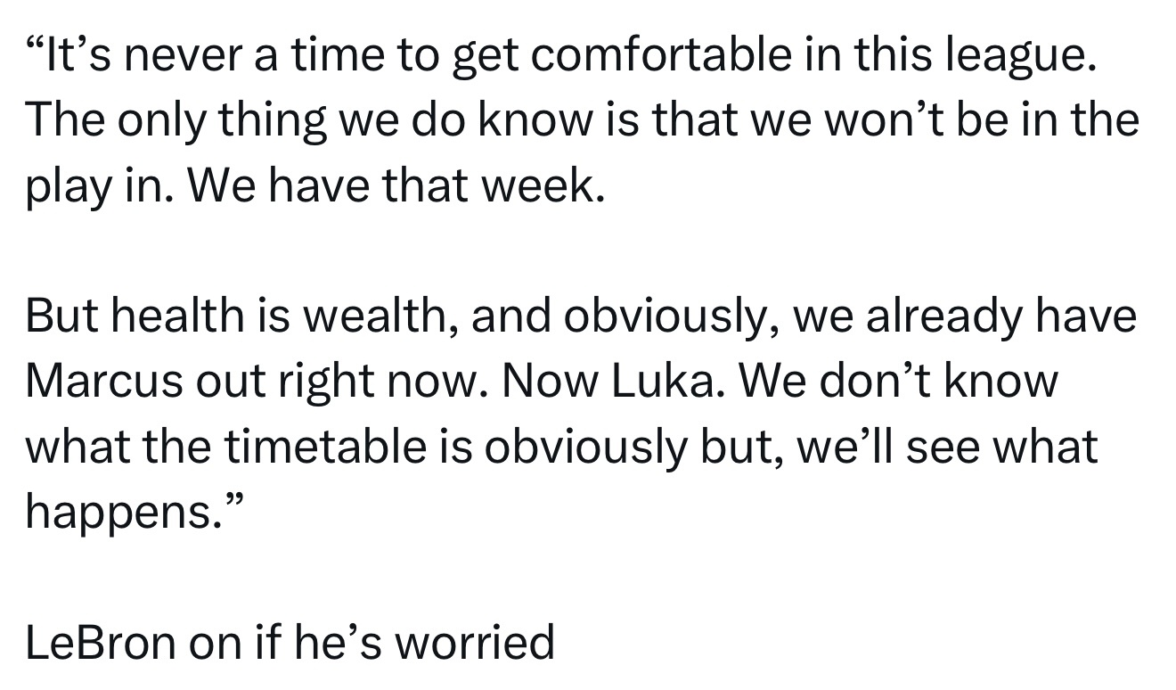 “在这个联盟里永远不能掉以轻心。目前唯一能确定的是我们无需参加附加赛,因此拥有(季后赛前的)一周备战时间。