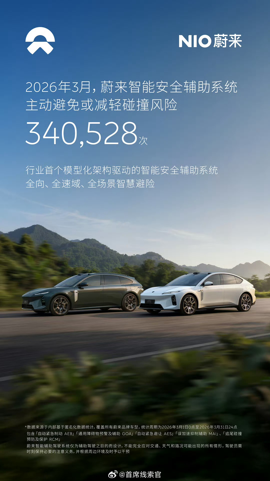 2026 年 3 月,蔚来模型化架构驱动的智能安全辅助系统,主动避免可能的碰撞与风险 340,528 次。