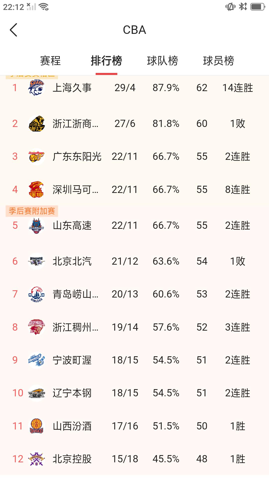 【CBA 常规赛最新排名】昨晚CBA 常规赛结束第33轮比赛,战绩排名再次发生变化。卫冕冠军广厦队客场惨败深圳队,与联盟榜首上海久事之间拉大到两场,同时深圳队强势晋级积分榜四强。截止今天早上最新战绩排名:上海久事29胜4负排名第一,浙江广厦27胜6负排名第二,广东队,深圳队,山东队战绩相同,均为〔22胜11负〕,广东队排名第三,深圳队排名第四,山东队排名第五。北京队21胜12负排名第六,青岛队20胜13负排名第七,浙江稠州金租19胜14负排名第八,宁波队18胜15负排名第九,辽宁队18胜15负排名第十。山西队17胜16负排名十一,北控队15胜18负排名十二,广州龙狮队14胜19负排名十三,吉林队13胜20负排名十四。新疆队12胜21负排名十五,福建队12胜21负排名十六。南京队11胜22负排名十七,江苏肯尼亚9胜24负排名十八,天津队9胜24负排名十九,四川队0胜33负排名垫底。