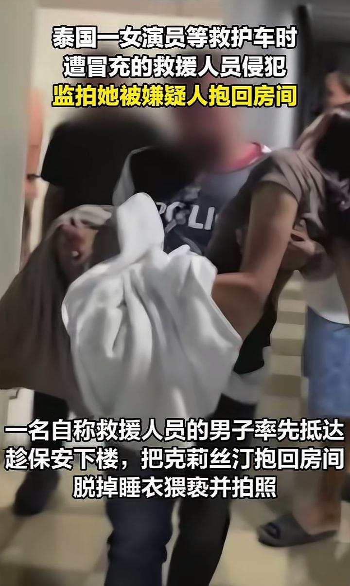 泰国女星等救护车时遭性侵 监控拍下全程 细思极恐 谁能想到,在自己公寓等救护车救命的时候,会被人冒充救援人员拖进房间侵犯? 3月31日凌晨,泰国女演员克莉丝汀因过敏服药出现严重副作用,叫了救护车后在公寓等候。 一名男子竟冒充救援人员,趁她意识模糊,直接将她抱回房间实施侵犯。 直到警察赶到,男子才慌忙给她穿好衣服、用毯子裹住。4月1日,克莉丝汀正式报案,目前嫌疑人已被捕。 更让人后怕的是,男子精准知道她在等救护车,身边无助理陪同,这真的只是巧合吗? 泰国 女星性侵