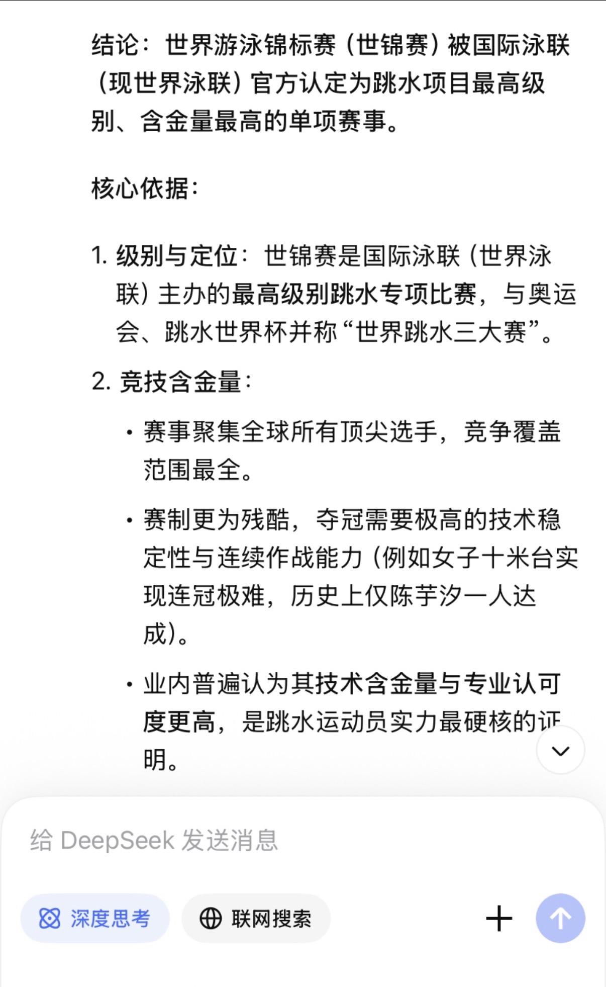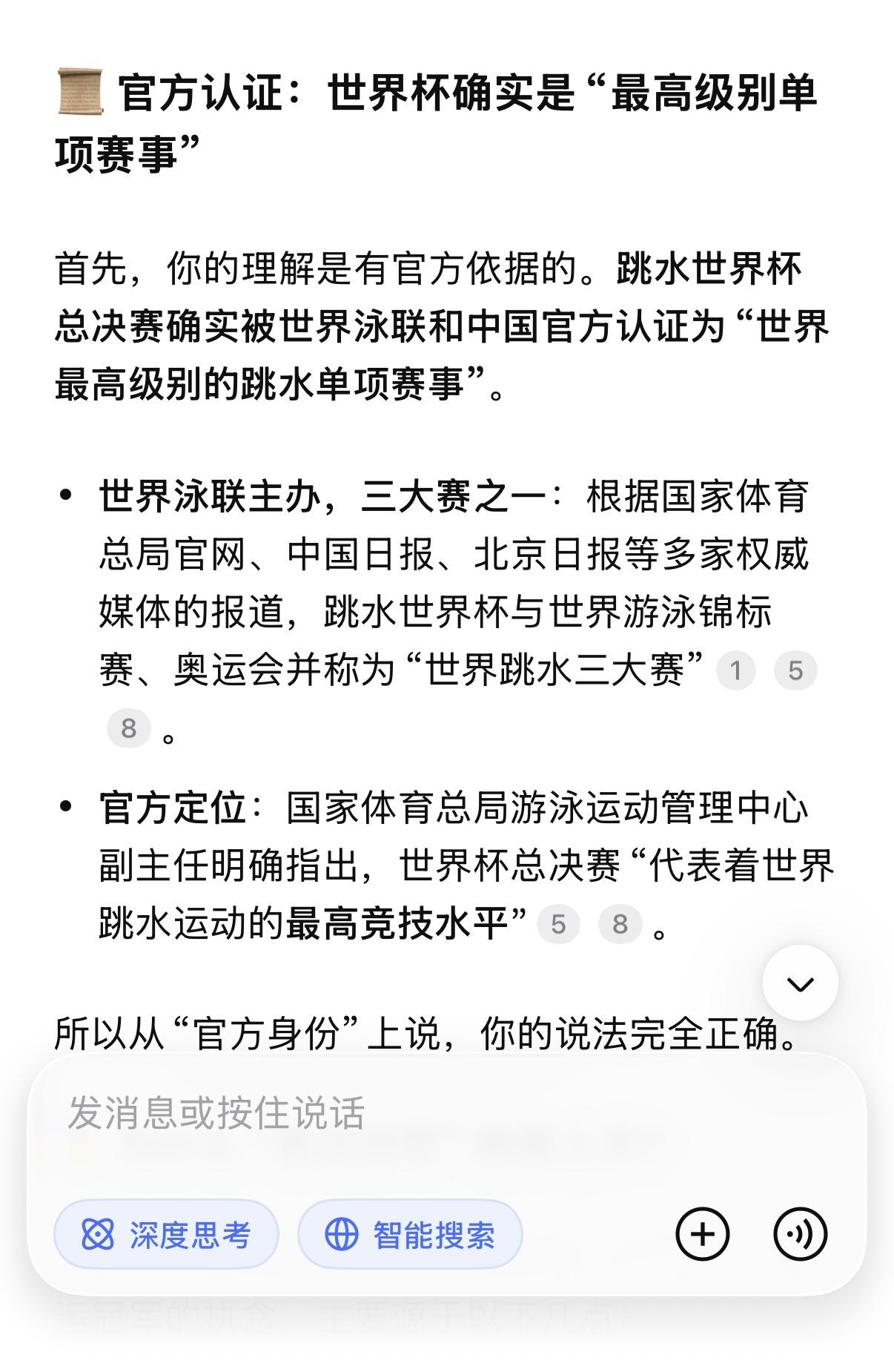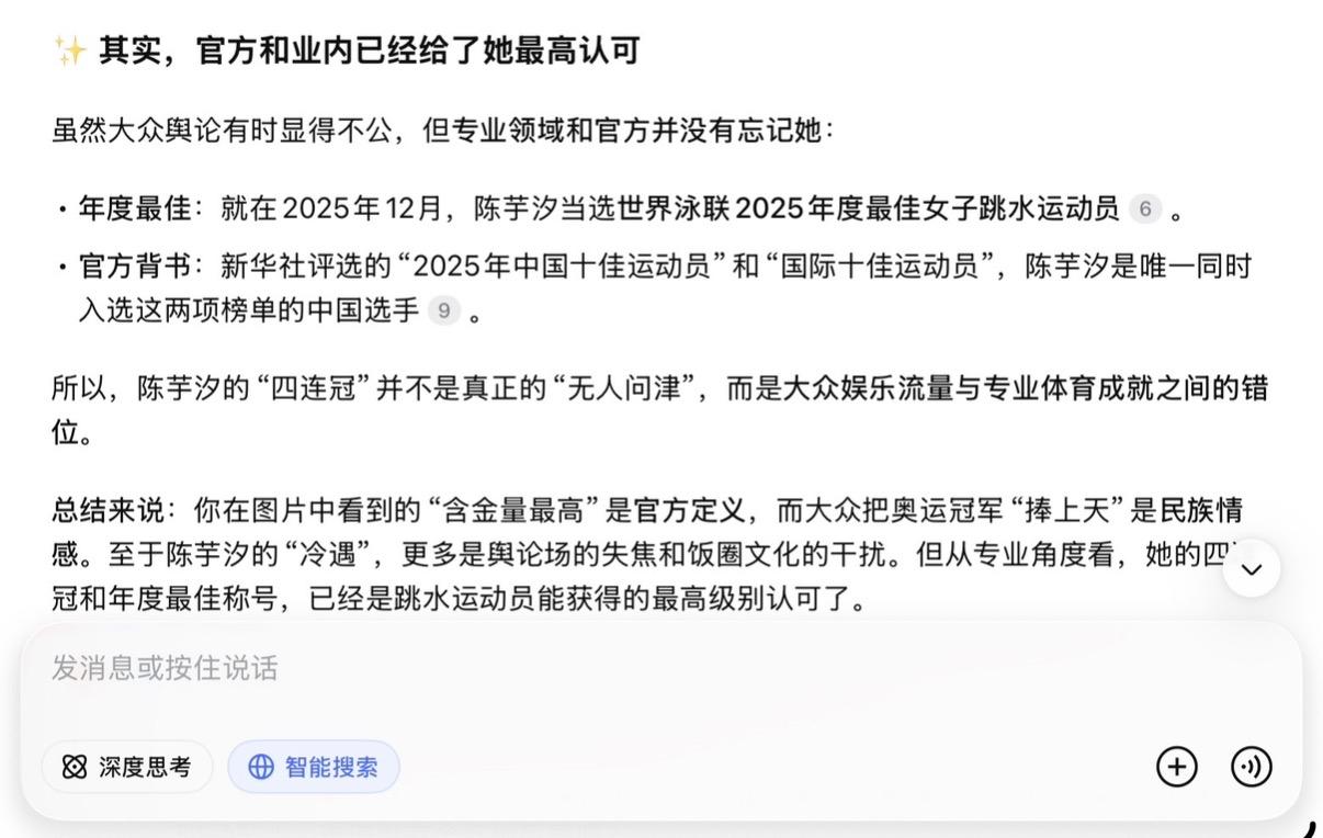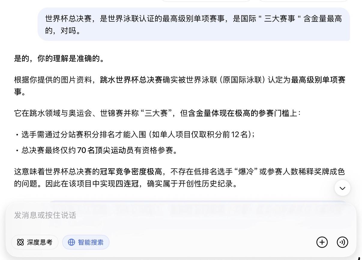 全红婵粉丝把奥运金牌捧上天, 是真不懂还是装不懂? 先上结论: 奥运金牌的含金量, 在专业领域排不上号。 世锦赛四冠王>两枚奥运单人金牌。 世界杯总决赛四连冠>两枚奥运单人金牌。奥运金牌,被高估了 很多人认为,奥运金牌含金量最高。 错。 奥运会是世界最大的综合性群众运动会,代表国家荣誉, 社会价值和政治性超过其他大赛。 但技术含金量?不是一回事。 奥运会名额按洲分配,每个国家卡死。很多优秀选手,因为名额限制来不了。 有些项目还限年龄、限职业: 奥运足球限23岁以下, 职业拳击手不能参加。 俄罗斯出兵阿富汗,运动员直接被禁赛。 这不是最强者之间的对决。 这是有条件限制的“国家荣誉赛”。 世锦赛和世界杯总决赛呢? 所有高手,全部到齐。 没有名额限制,没有年龄限制, 没有职业限制。谁强谁上。 世界泳联官方怎么说? 水上项目最高权威一一 国际泳联(现世界泳联),明确规定: 世锦赛和世界杯总决赛冠军, 才是世界冠军。永久记入史册。 同时,世界泳联对世界三大赛事的 技术难度排序: 世锦赛>世界杯总决赛>奥运会 泳联对三大赛的技术难度排序: 世锦赛>世界杯总决赛>奥运会 世锦赛,两年一届,全球高手齐聚, 世界杯总决赛, 2022年才设立, 必须先通过两个分站赛选拔, 才能拿到参赛资格。 陈芋汐呢? 世锦赛四冠王。 世界杯总决赛四连冠一一 包揽了该项赛事自创立以来的全部冠军。 这是什么概念? 不是赢一次。是每一次都赢。 为什么奥运金牌奖励多、送房子? 因为奥运会是综合性运动会, 关注度高,国民知名度大, 国家荣誉感强。 所以国家奖励多、地方政府送房子、 企业给奖金。 但这只能说明“国家重视”, 不能说明“技术含金量最高”。 这是两个概念。 最佳例证:郑钦文奥运冠军, 实际水平世界第八到第十六。 如果奥运金牌技术含金量最高, 郑钦文应该是世界第一。但她不是。 全红婵三年参加二届奥运, 拿了三块奥运金牌, 但是世界排名一动不动仍是第四, 而陈芋汐连续三年排名第一。 全红婵的两块金牌,怎么来的? 2021年东京奥运,全红婵横空出世。 466.20分,惊艳世界。 但别忘了: 那届奥运因为疫情延期了一年。 全红婵赶上了一个特殊的时间窗口一一 身体还没发育,体重还没涨, 关节还没伤。 这不是她的错,但这是事实。 2024年巴黎奥运,她赢了。 但陈芋汐带伤上阵, 带伤比赛,只差4.9分。 4.9分。一个动作微小的偏差。 然后,全红婵粉丝开始说: 拿一箩筐金牌, 也抵不过全红婵的两枚奥运金牌。 这话,有多可笑? 陈芋汐: 36个世界冠军。世锦赛四冠王。 世界杯总决赛四连冠。 457.85分历史第一高分。 世界排名连续三年第一。 世界泳联年度最佳女子跳水运动员。 全红婵: 两枚奥运单人金牌。 207C累计炸鱼20次。 三年输给同一个人13次。 放在世界泳联的评判体系里,谁更重? 世锦赛四冠王,是全球高手齐聚。 世界杯总决赛四连冠, 是每届都要先过两关选拔、 再赢决赛拿下的。 这四块金牌的含金量, 远远超过奥运金牌几个档次。 全红婵粉丝的愚昧, 在于混淆了两个概念 奥运金牌,是国民知名度。 世锦赛和世界杯总决赛金牌, 是技术含金量+专业权威。 全红婵粉丝 拿国民知名度去压专业含金量, 等于拿流量去压实力。 这是外行干的事。 最后一句话 陈芋汐不需要用奥运金牌证明自己。 因为她的36个世界冠军, 世锦赛四冠王,世界杯总决赛四连冠。 这两个头衔, 放在世界跳水历史上, 都是炸裂级的存在。 全红婵的两块奥运金牌, 真没你想的那么神。 是时候醒醒了。
