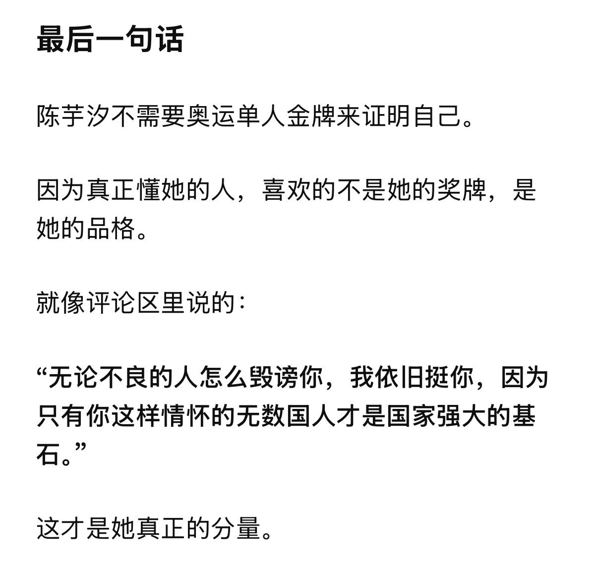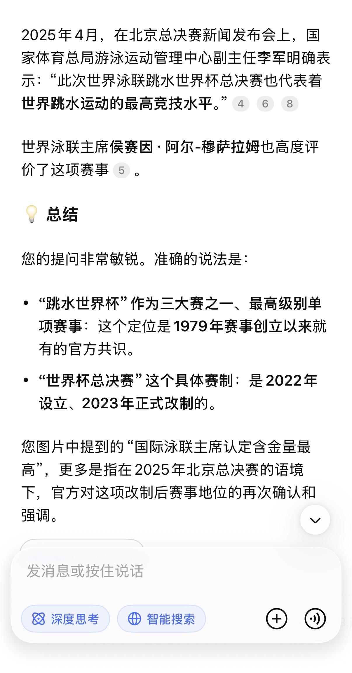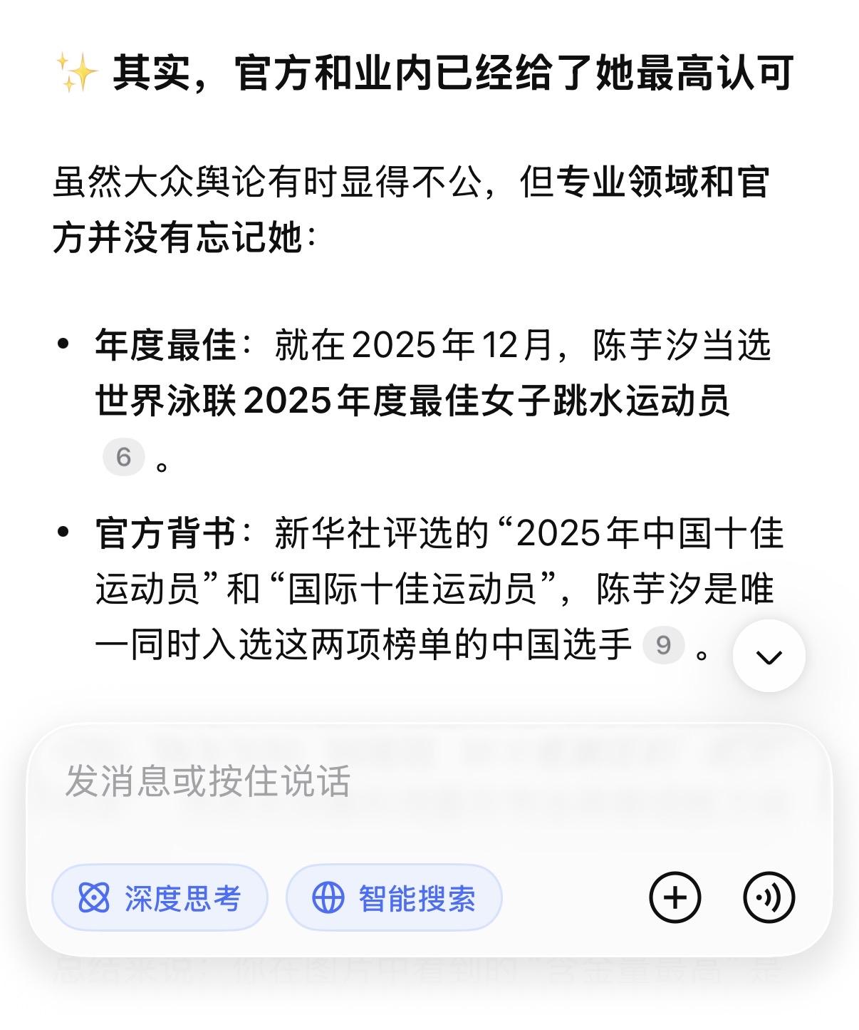 全红婵粉丝把奥运金牌捧上天, 是真不懂还是装不懂? 先上结论: 奥运金牌的含金量, 在专业领域排不上号。 世锦赛四冠王>两枚奥运单人金牌。 世界杯总决赛四连冠>两枚奥运单人金牌。奥运金牌,被高估了 很多人认为,奥运金牌含金量最高。 错。 奥运会是世界最大的综合性群众运动会,代表国家荣誉, 社会价值和政治性超过其他大赛。 但技术含金量?不是一回事。 奥运会名额按洲分配,每个国家卡死。很多优秀选手,因为名额限制来不了。 有些项目还限年龄、限职业: 奥运足球限23岁以下, 职业拳击手不能参加。 俄罗斯出兵阿富汗,运动员直接被禁赛。 这不是最强者之间的对决。 这是有条件限制的“国家荣誉赛”。 世锦赛和世界杯总决赛呢? 所有高手,全部到齐。 没有名额限制,没有年龄限制, 没有职业限制。谁强谁上。 世界泳联官方怎么说? 水上项目最高权威一一 国际泳联(现世界泳联),明确规定: 世锦赛和世界杯总决赛冠军, 才是世界冠军。永久记入史册。 同时,世界泳联对世界三大赛事的 技术难度排序: 世锦赛>世界杯总决赛>奥运会 泳联对三大赛的技术难度排序: 世锦赛>世界杯总决赛>奥运会 世锦赛,两年一届,全球高手齐聚, 世界杯总决赛, 2022年才设立, 必须先通过两个分站赛选拔, 才能拿到参赛资格。 陈芋汐呢? 世锦赛四冠王。 世界杯总决赛四连冠一一 包揽了该项赛事自创立以来的全部冠军。 这是什么概念? 不是赢一次。是每一次都赢。 为什么奥运金牌奖励多、送房子? 因为奥运会是综合性运动会, 关注度高,国民知名度大, 国家荣誉感强。 所以国家奖励多、地方政府送房子、 企业给奖金。 但这只能说明“国家重视”, 不能说明“技术含金量最高”。 这是两个概念。 最佳例证:郑钦文奥运冠军, 实际水平世界第八到第十六。 如果奥运金牌技术含金量最高, 郑钦文应该是世界第一。但她不是。 全红婵三年参加二届奥运, 拿了三块奥运金牌, 但是世界排名一动不动仍是第四, 而陈芋汐连续三年排名第一。 全红婵的两块金牌,怎么来的? 2021年东京奥运,全红婵横空出世。 466.20分,惊艳世界。 但别忘了: 那届奥运因为疫情延期了一年。 全红婵赶上了一个特殊的时间窗口一一 身体还没发育,体重还没涨, 关节还没伤。 这不是她的错,但这是事实。 2024年巴黎奥运,她赢了。 但陈芋汐带伤上阵, 带伤比赛,只差4.9分。 4.9分。一个动作微小的偏差。 然后,全红婵粉丝开始说: 拿一箩筐金牌, 也抵不过全红婵的两枚奥运金牌。 这话,有多可笑? 陈芋汐: 36个世界冠军。世锦赛四冠王。 世界杯总决赛四连冠。 457.85分历史第一高分。 世界排名连续三年第一。 世界泳联年度最佳女子跳水运动员。 全红婵: 两枚奥运单人金牌。 207C累计炸鱼20次。 三年输给同一个人13次。 放在世界泳联的评判体系里,谁更重? 世锦赛四冠王,是全球高手齐聚。 世界杯总决赛四连冠, 是每届都要先过两关选拔、 再赢决赛拿下的。 这四块金牌的含金量, 远远超过奥运金牌几个档次。 全红婵粉丝的愚昧, 在于混淆了两个概念 奥运金牌,是国民知名度。 世锦赛和世界杯总决赛金牌, 是技术含金量+专业权威。 全红婵粉丝 拿国民知名度去压专业含金量, 等于拿流量去压实力。 这是外行干的事。 最后一句话 陈芋汐不需要用奥运金牌证明自己。 因为她的36个世界冠军, 世锦赛四冠王,世界杯总决赛四连冠。 这两个头衔, 放在世界跳水历史上, 都是炸裂级的存在。 全红婵的两块奥运金牌, 真没你想的那么神。 是时候醒醒了。