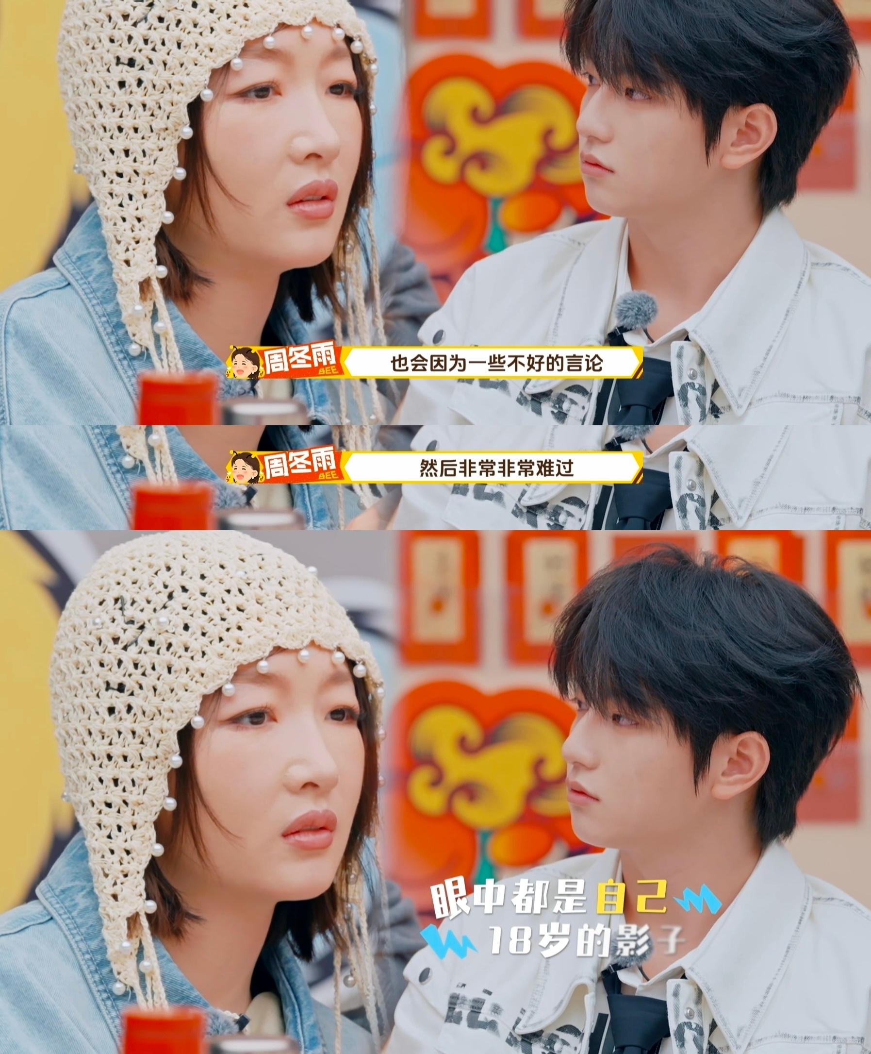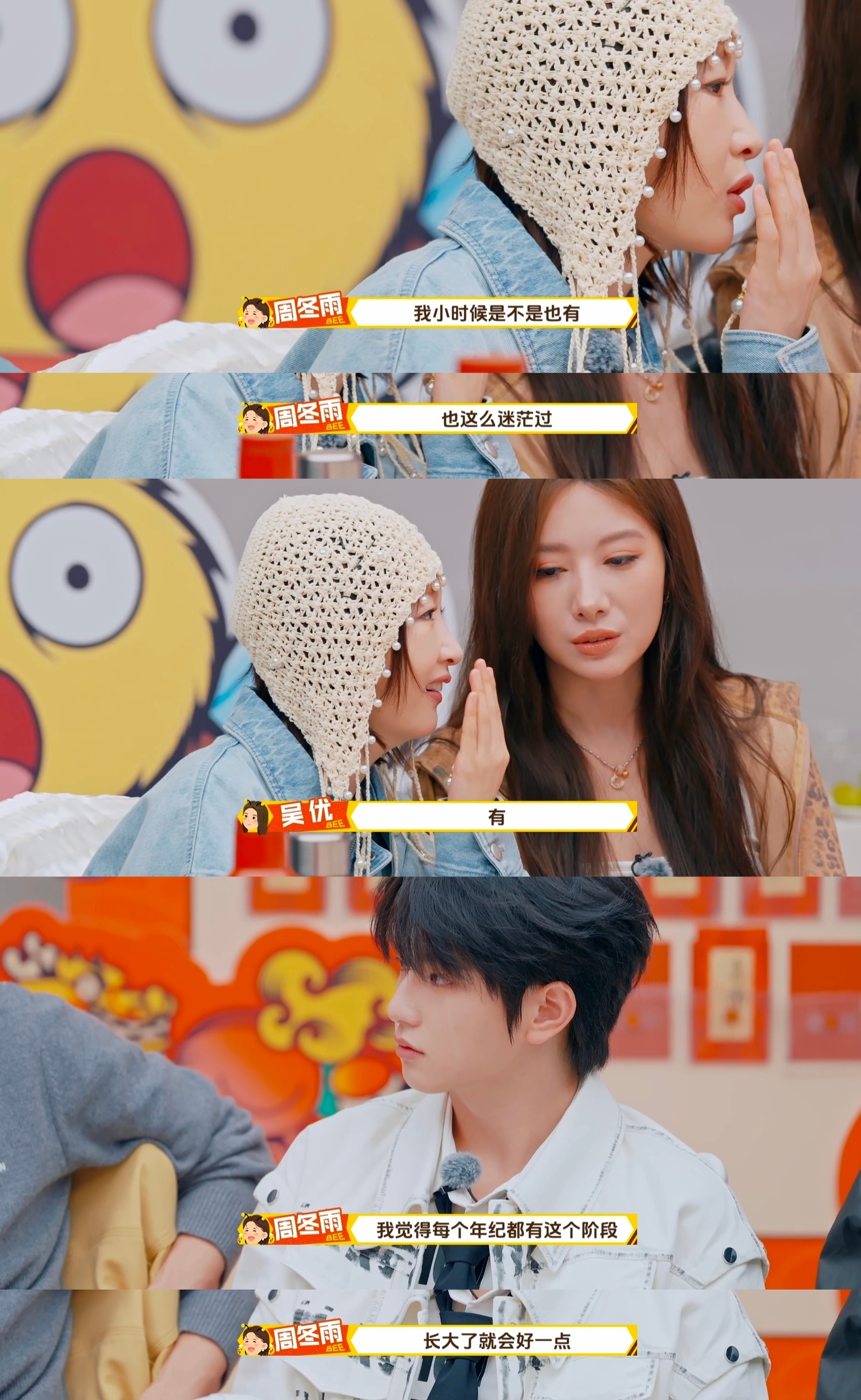 周冬雨曾和18岁的穆祉丞一样迷茫周冬雨:我觉得每个年纪都有这个阶段,长大了就会好一点,他让我想到了我的过去,我小时候和弟弟差不多,也都迷茫过。用自己的经历和经验去开导穆祉丞,从淋雨人到撑伞人,好暖!周五晚高疯