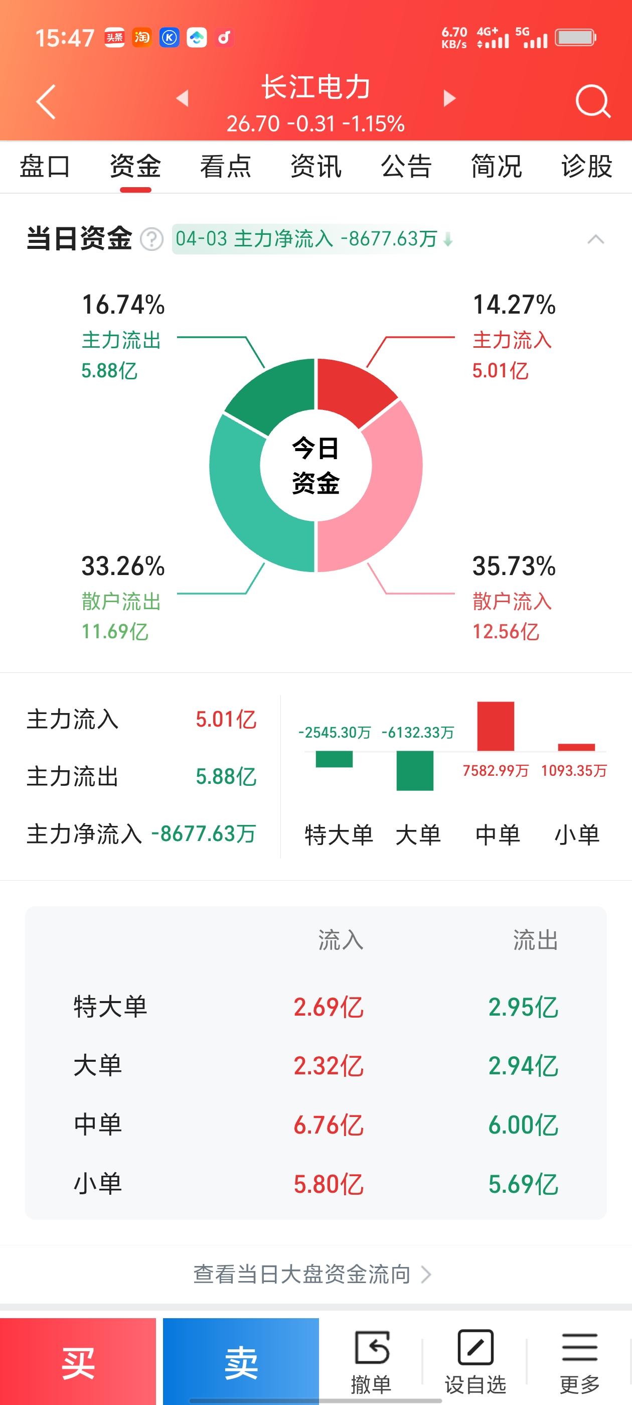 紧急!长江电力今日资金流出8677万,长电到底怎么了? 家人们!今天盯着长江电力(600900)盘面的兄弟,估计心里都咯噔一下——股价跌了1.15%,主力资金直接净流出8677.63万! 很多持有长电的朋友都在问:这是主力跑路了?还是长电的逻辑变了? 今天咱们就掰开揉碎,把这一天的资金细节、背后逻辑、以及后续操作,一次性讲清楚! 一、今日资金全景:主力撤退,散户接盘? 先看核心数据,今天的资金流向特别有意思,完全是机构与散户的反向操作: - 主力资金:流入5.01亿,流出5.88亿,净额**-8677.63万**。其中特大单流出2.95亿,大单流出2.94亿,明显是大资金在撤退。 - 散户资金:流入12.56亿,流出11.69亿,净额**+8700万**。典型的散户在抄底、接盘。 - 中/小单:中单流入6.76亿、流出6.00亿;小单流入5.80亿、流出5.69亿,资金呈现散户化、碎片化特征。 划重点:主力在大笔卖出,散户在拼命买入,这种背离走势,短期情绪肯定承压。 二、为什么今天会跌?3大核心原因 结合当下市场环境,长电今日调整并非偶然,主要有3个原因: 1. 电力板块集体回调,跟风效应 今天整个电力板块都在调整,主力资金对高股息、防御性板块的短期获利了结意愿强烈。长江电力作为板块龙头,自然成为资金调仓的首选,板块情绪拖累是主因。 2. 估值高位,机构兑现利润 从基本面看,长电当前PB约3.23倍,略高于长期合理估值;且股息率约3%,在利率回升背景下,吸引力边际下降。机构在估值高位区间,选择兑现部分利润,属于正常的高抛操作。 3. 市场风格切换,资金追逐热点 近期AI、半导体等成长赛道活跃,市场资金从防御性板块流向高弹性赛道。长电这种类债券属性的资产,短期自然会被资金冷落,这是风格轮动的必然结果。 三、是机会还是陷阱?分情况看 虽然今天流出,但千万别盲目恐慌,长电的逻辑远没到崩塌的地步,分两种情况看: ✅ 对于长期持有者(价值投资派) 完全不用慌,甚至是加仓机会! 长电的核心是全球第一水电龙头+70%高分红承诺+现金流稳定,这是A股最硬的“护城河”之一。 今天的调整只是短期情绪波动,不影响长期基本面。只要你拿得住,股息+股价修复,收益依然有保障。 ❌ 对于短线/波段交易者 短期确实要避避风头! 既然主力在出逃,短线资金就不该逆势接盘。短期大概率会在26-27元区间震荡磨底,建议观望,不要盲目抄底,等主力资金回流再进场。 四、后续操作建议(干货!) 给不同类型的投资者,明确的操作方向: 1. 长线拿分红:无视短期波动,越跌越分批加仓,锁定每年4%左右的股息,吃时间的红利。 2. 短线做波段:暂时离场观望,等主力资金重新净流入、股价站稳27元上方,再考虑回补。 3. 心态提醒:长电这种票,波动本就小,一天的涨跌太正常了。不要被单日的资金流出吓倒,看长不看短,才是赚长电钱的核心逻辑。 最后提醒一句:投资有风险,交易需谨慎。今天的流出只是短期信号,咱们跟着资金和基本面走,不盲目、不恐慌,才是炒股的长久之道!