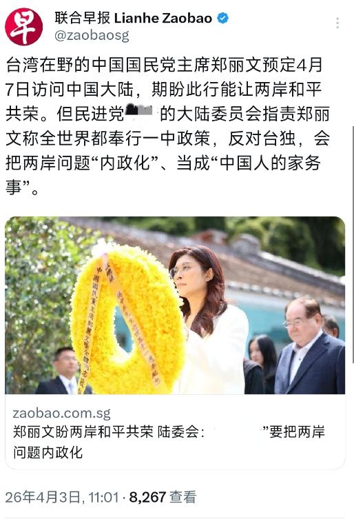 新加坡联合早报今天(4月3日)写道:“台湾在野的中国国民党主席郑丽文预定4月7日访问中国大陆,期盼此行能让两岸和平共荣。但民进党当局的大陆委员会指责郑丽文称全世界都奉行一中政策,反对台独,会把两岸问题‘内政化’、当成‘中国人的家务事’。” 看到民进党这番指责,估计不少人都要笑出声来。全世界奉行一中政策是国际社会公认的事实,联合国第2758号决议早已明确了一个中国原则,目前182个与中国建交的国家,无一不承认世界上只有一个中国,台湾是中国不可分割的一部分。民进党拿这个当借口指责郑丽文,说白了就是在自欺欺人,怕两岸和平交流断了他们“抗中谋独”的财路。 可能有些朋友对郑丽文不太熟悉,这位国民党主席的经历可不简单。她1969年出生于台湾云林县,台大法律系毕业,还留过洋拿了法学硕士学位。年轻时她曾加入民进党,后来看透了陈水扁当局的虚伪,2002年毅然退党,2005年经连战介绍加入国民党,从此成为反“台独”的坚定力量。这些年她在台湾政坛敢说敢言,痛批“台独”是骗人的谎言,直言“我是中国人”是自然而然的文化历史认同,还多次强调“九二共识”是两岸和平的定海神针,这样的立场难怪让民进党坐立难安。 这次郑丽文访陆,可不是一时兴起。根据官方公布的行程,4月7日到12日,她将率领代表团先后前往江苏、上海、北京三地。首站南京会去中山陵敬谒,延续2005年连战“和平之旅”的历史脉络,这份传承本身就意义非凡。在上海,他们要重点谈台湾农渔产品输陆通关便利化、台商权益保障这些民生实事,而到了北京,还会与大陆方面举行正式会谈,进一步夯实“九二共识”的政治基础。随行人员里既有国民党两岸事务核心力量,还有连战次子连胜武,这样的阵容足以看出国民党对此次交流的重视。 民进党当局一边跳脚指责,一边还放出狠话恐吓。台陆委会主委邱垂正公开警告,说未经授权与大陆进行政治性协议最重可判五年有期徒刑,行政机构负责人卓荣泰更是扯着军购预算的由头,暗示可能有“机密外泄风险”。这种上蹿下跳的样子,恰恰暴露了他们的恐慌。他们最怕的是什么?怕的是两岸民众重新走近,怕的是“台独”谎言被戳穿,怕的是自己靠制造对立谋利的日子到头了。 要知道,台湾民众早就厌倦了民进党搞的政治对立。近年台湾《联合报》的民调显示,稳定多数民众希望两岸关系缓和,不希望台海变成战场。这几年民进党当局一门心思搞“抗中”,结果呢?台湾经济下行压力越来越大,农渔产品卖不出去,年轻人就业机会越来越少,这些苦果最终都要普通民众来咽。而郑丽文此次访陆,正是要回应民众的期盼,通过务实交流为台湾找一条和平发展的出路。她行前强调的“两岸就是同一个中国”九个字,字字千钧,道出了两岸关系的本质,也给渴望和平的两岸同胞吃下了定心丸。 大陆方面的态度一直很明确。国台办早就表态,愿意在坚持“九二共识”、反对“台独”的基础上,加强与台湾各政党的沟通,促进两岸交流合作。就在郑丽文访陆前夕,大陆还亮出了统一后的基建蓝图,明确提出要推进环岛高铁和东西向高速建设,让台湾的交通更便捷,让东部的农林渔牧产品能快速直达大陆市场。这可不是画大饼,而是有“十五五”规划做支撑,有川藏铁路这样的工程经验做保障,实实在在是为台湾民众谋福利。 回顾历史,2005年连战的“和平之旅”取得了“三项体认”和“五个促进”的丰硕成果,推动两岸进入交流合作的黄金期。如今时隔近十年,国民党主席再次率团访陆,这是两岸关系中的一件大事。它打破了民进党长期编织的“两岸无对话可能”的谎言,证明只要坚持“九二共识”,两岸就有沟通的渠道和空间。更重要的是,它给岛内支持和平的力量提供了一个政治支点,让大家看到,除了民进党那条“战争之路”,台湾还有和平发展的更好选择。 民进党把两岸问题炒作成“国际议题”,其实是打错了算盘。两岸同属一中,这是历史定论,也是法理事实,无论他们怎么勾结外部势力,怎么操弄意识形态,都改变不了这个根本。郑丽文说两岸问题是“中国人的家务事”,恰恰说到了点子上——一家人的事情,就该坐下来好好谈,没必要让外人指手画脚,更不能搞分裂对抗。 当然,我们也清楚,单靠一次访问解决不了所有问题。两岸关系的改善需要一个过程,需要更多的互信积累。但只要方向是对的,迈出的每一步都有意义。郑丽文此次访陆,是两岸关系中的一股暖流,它让我们看到了和平的希望,也让我们更加坚信,顺应历史大势、符合两岸同胞利益的事情,终将得到广泛支持。 接下来的几天,让我们共同关注这次“和平之旅”的进展。相信在两岸同胞的共同期盼下,这次访问一定能取得丰硕成果,为台海和平稳定注入新的动力。而那些妄图阻挠两岸交流、破坏国家统一的势力,最终只会被历史唾弃,被两岸同胞所不齿。毕竟,和平发展是主流民意,国家统一是历史必然,这是谁也阻挡不了的大势。