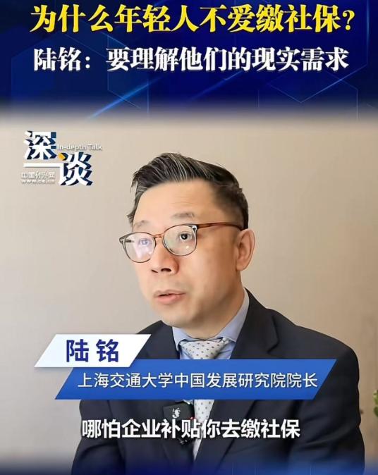 陆铭谈年轻人拒缴社保:“为什么年轻人不爱缴?要理解他们的现实需求!” 长久以来,每当提到年轻人不愿缴纳社保,不少人会不假思索地给这个群体贴上“目光短浅”的标签。 认为这代年轻人只想着及时行乐、享受当下,压根没有长远规划,把晚年生活的保障抛到了九霄云外。 就在这种声音在社会上不断扩散时,上海交通大学的陆铭教授,在近期的一场公开活动中,专门谈及到了这一备受社会关注的热点话题。 陆铭教授没有一味批评年轻人,反而抛出了一个值得每一个人静下心来思考的问题:“为什么年轻人不爱缴?” 话音刚落,他便给出了一句瞬间击中无数年轻人内心的回应——要理解他们的现实需求! 如今,打开各类社交平台,关于社保的讨论随处可见,而一个明显的趋势是,越来越多20到30岁之间的年轻人,正在主动放弃缴纳社保。 曾经,社保是大家眼中“铁打的必选”,找工作时最先问的就是“缴不缴社保”。 可现在,这份“安全感”在很多年轻人眼里,已经从必须拥有的“刚需”,变成了可加可减的“附加项”,甚至有不少人直接选择放弃。 有相关数据显示,35岁以下的群体中,明确表示不愿意缴纳社保的比例已经超过了四分之一,而在灵活就业的年轻人里,这个比例更是高达三成以上。 普通家庭年轻人的薪资水平大多高不到哪里去,每月的收入大多只能维持基本生存,很难有多余的结余。 单是租一间能遮风挡雨、勉强满足居住需求的小单间,每个月的租金就足以占去月收入的三成到五成,这一笔固定支出,就已经让很多年轻人倍感吃力。 除此之外,每日的饮食开销、上下班的通勤费用、每月的水电燃气和物业费,再加上偶尔需要应付的人情往来,以及换季时添置衣物的开支。 零零总总算下来,几乎让年轻人每个月的收入都消耗殆尽。 有时候一旦遭遇生病、突发意外等措手不及的情况,手头没有积蓄的他们,只能依靠信用卡透支,或是向家人求助接济,才能勉强渡过难关。 而且,现如今很多的年轻人,和老一辈在思想上有着差异。 老一辈大多秉持着“居安思危、未雨绸缪”的生活理念,在他们的认知里,社保就像是晚年生活必不可少的保障。 为了能在年老后拥有安稳的生活,他们愿意在当下省吃俭用,哪怕降低自己的生活品质,也会坚持按时缴纳社保,把长远的安稳放在首位。 但当下的年轻人,却有着截然不同的价值取向,他们更推崇“把握当下、享受当下”的生活方式,不希望为了遥远且不确定的未来,过度消耗当下的生活热情。 在他们看来,与其把辛苦赚来的钱,禁锢在几十年后才能动用的社保账户里,不如攥在自己手中,用在能切实改善当下生活的地方。 而陆铭教授的那些话,之所以能引发那么多年轻人的共鸣,是因为他没有站在居高临下的角度说教,而是真正走进了年轻人的生活。 对很多年轻人来说,都觉得相较于等待几十年后才能看到回报的社保,他们更倾向于将钱投入到能立刻获得满足感的事情上,而且手里的现金,是他们应对生活不确定性的唯一底气。