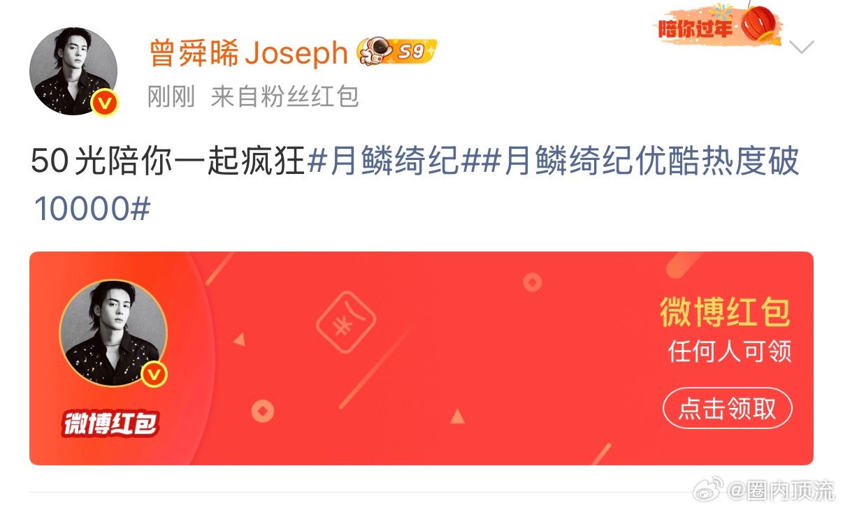 曾舜晞又发了3万红包 曾舜晞又发了3万红包,此男就是如此大方,好好好没抢到的我一点都不忮忌曾舜晞月鳞绮纪热度破10000红包曾舜晞