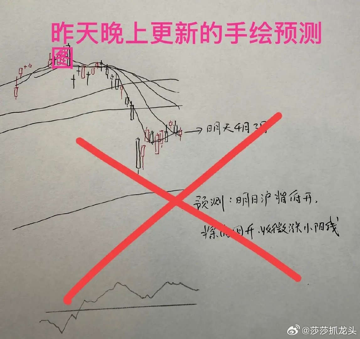 然后大家看一下我昨天更新的关于今天走势的手绘预测图。其实这个手绘预测图还是有机会实现的,因为昨天晚上美股三大指数低开走高,纳指最终还上涨了0.18%。今天亚太市场的走势其实也并不差。昨天收盘之后的这个预判,可以说又被主力狠狠的狙击了。市场就是这样,充满了魅力,同时有十分善变,很难预测。