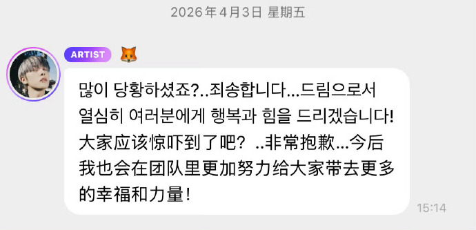 “大家应该惊吓到了吧?..非常抱歉…今后我也会在团队里更加努力给大家带去更多的幸福和力量!”