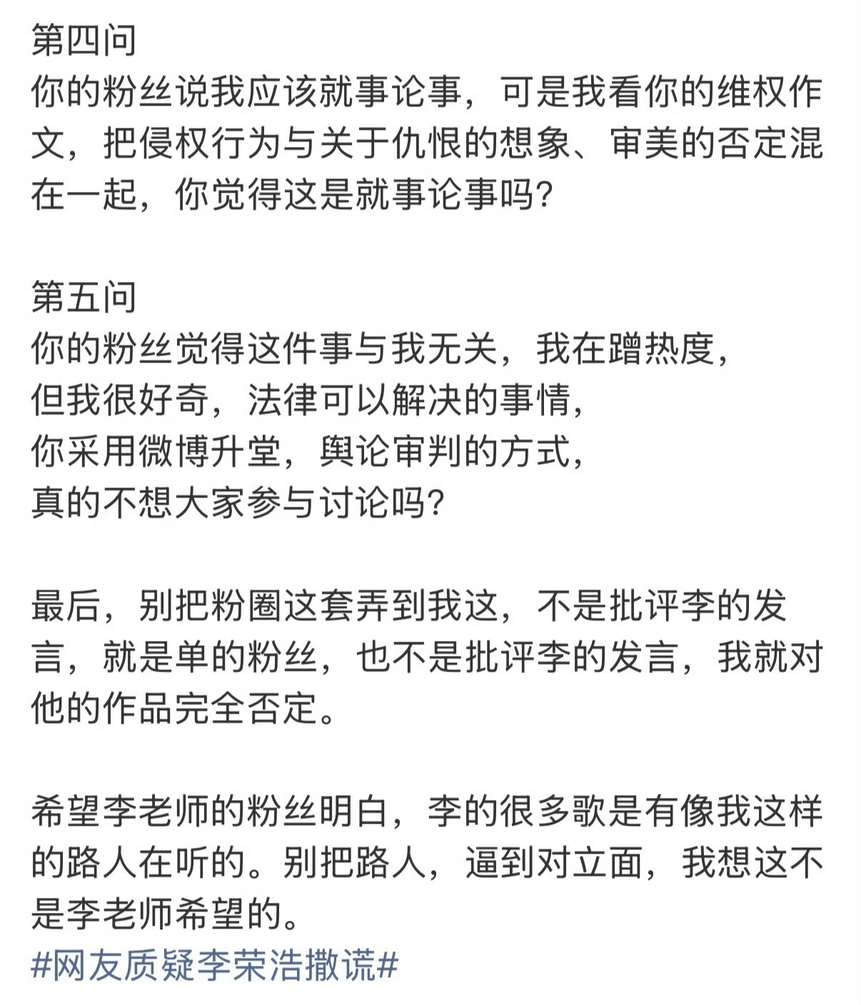 很好,李荣浩挑起了关于音乐版权的话题更多的人参与了进来讨论,这不是坏事真理越辩越明,如果有更多版权保护方面的专业人士也能加入这场讨论,那就更好了……