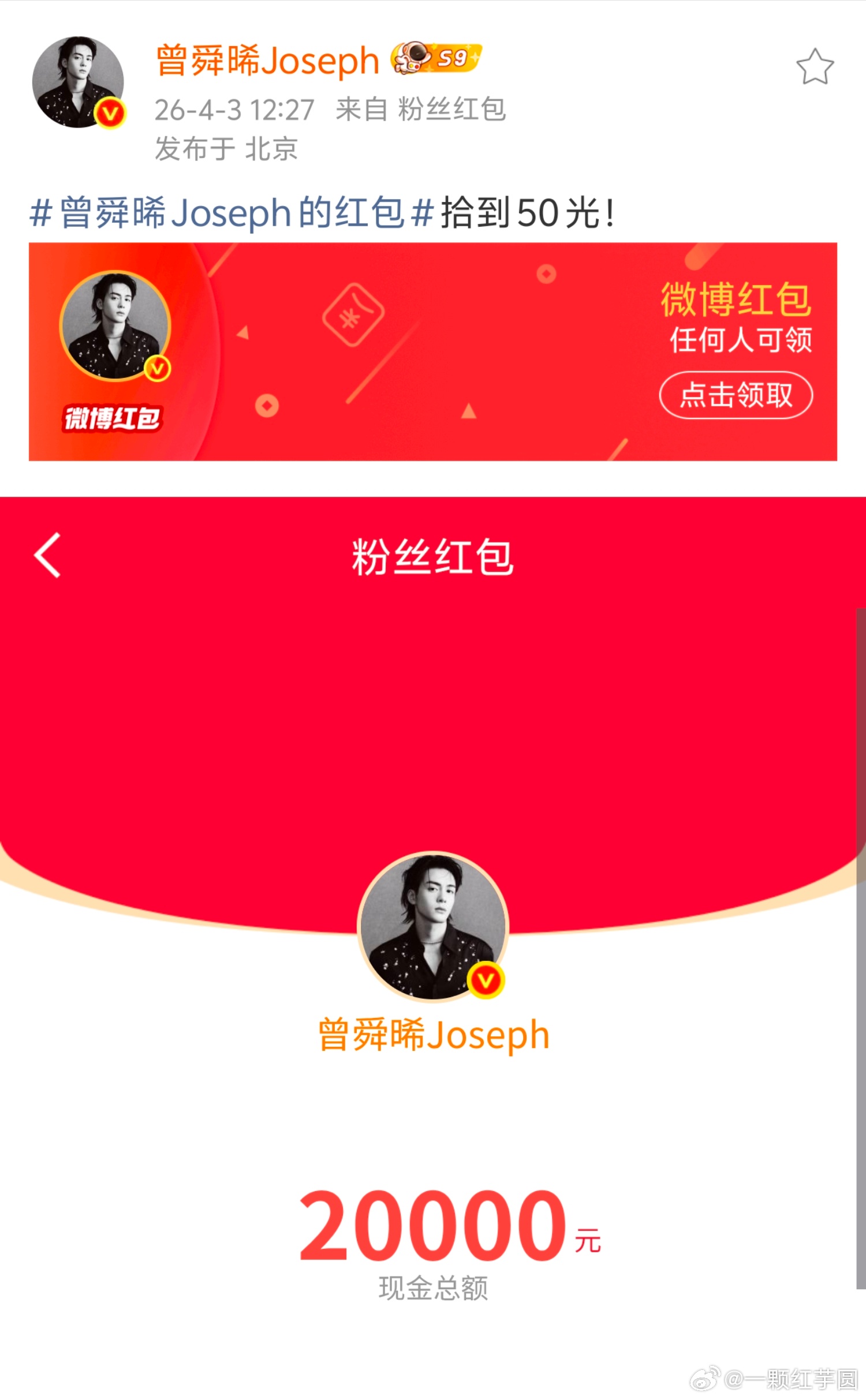 曾舜晞好大方!!又发了2w红包!!月鳞绮纪开播以来发了4w了曾舜晞2万剧宣红
