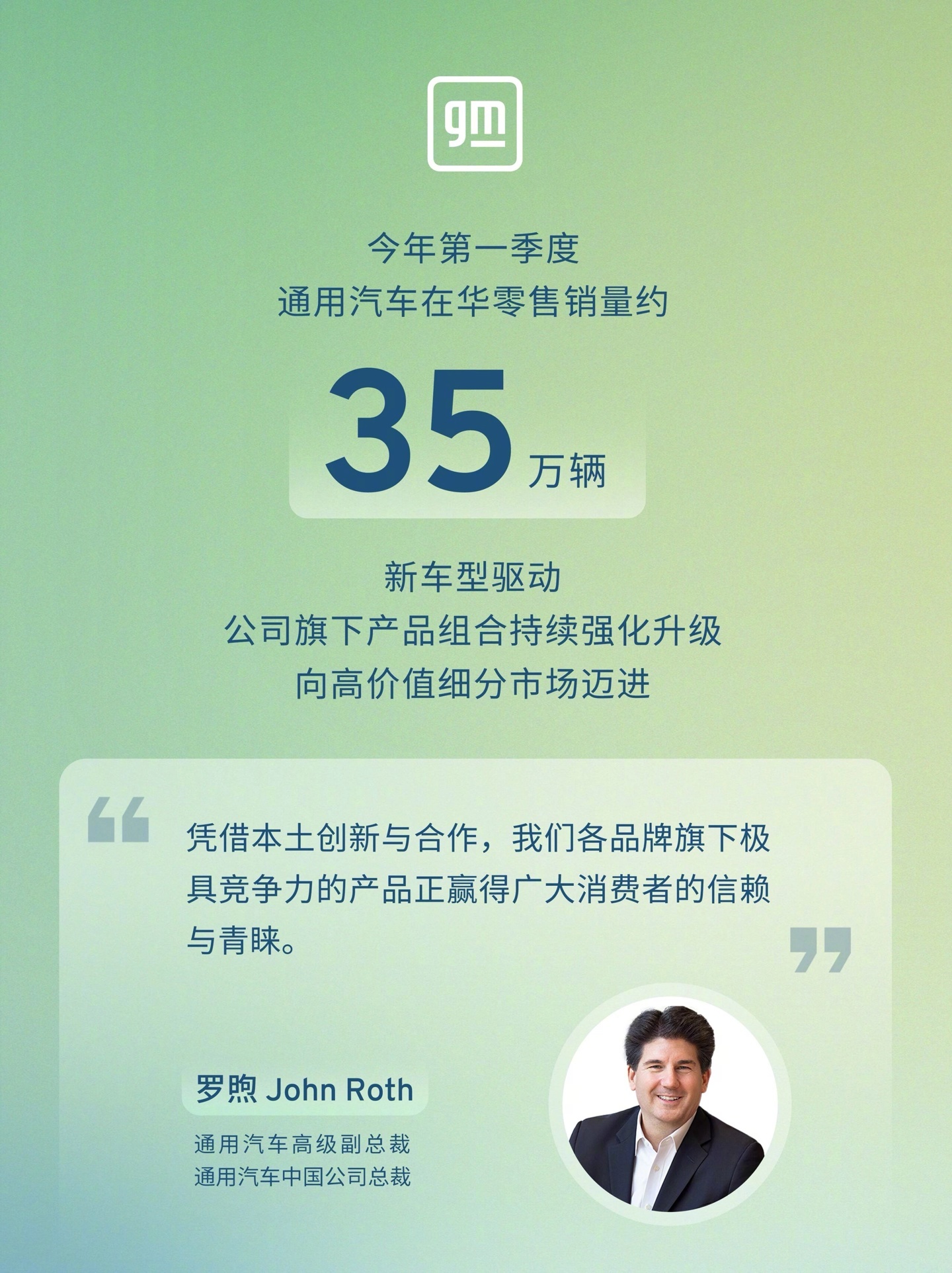 【通用汽车一季度在华销量约35万辆,多款 SUV 及旗舰车型本月见】4 月 3 日消息,今天下午,通用汽车通过官方公众号发文宣布:今年第一季度,通用汽车在华零售销量约 35 万辆。通用汽车高级副总裁兼通用汽车中国公司总裁罗煦(John Roth)表示:“凭借本土创新与合作,我们各品牌旗下极具竞争力的产品正赢得广大消费者的信赖与青睐。”
