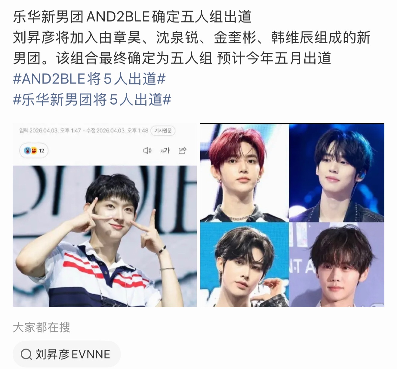 乐华新男团AND2BLE确定五人组出道刘昇彦将加入由章昊、沈泉锐、金奎彬、韩维辰