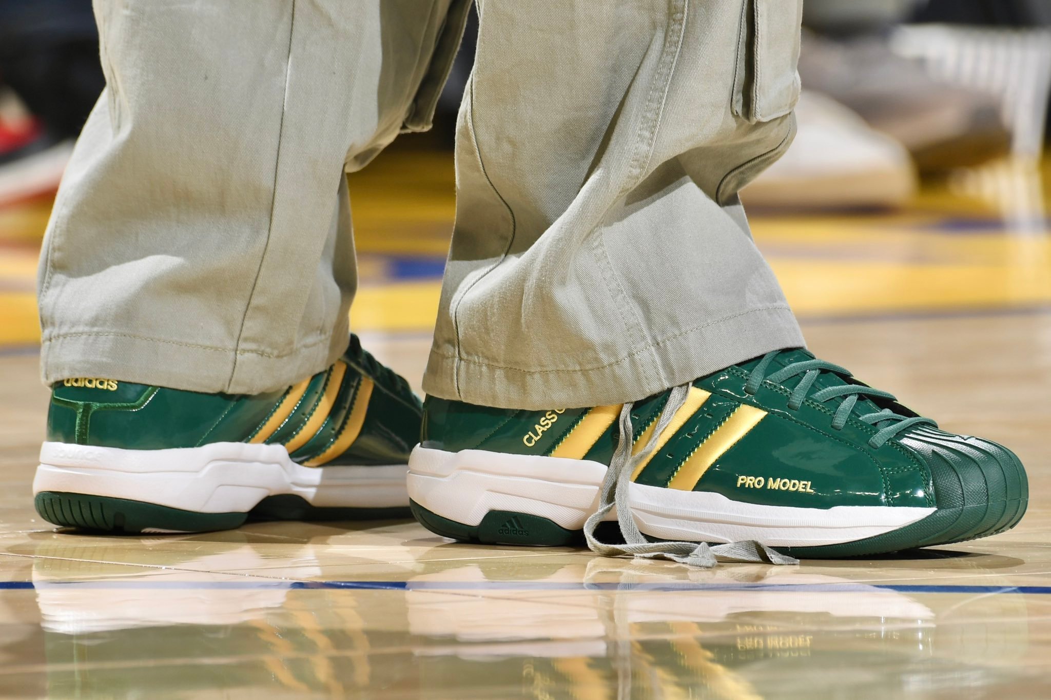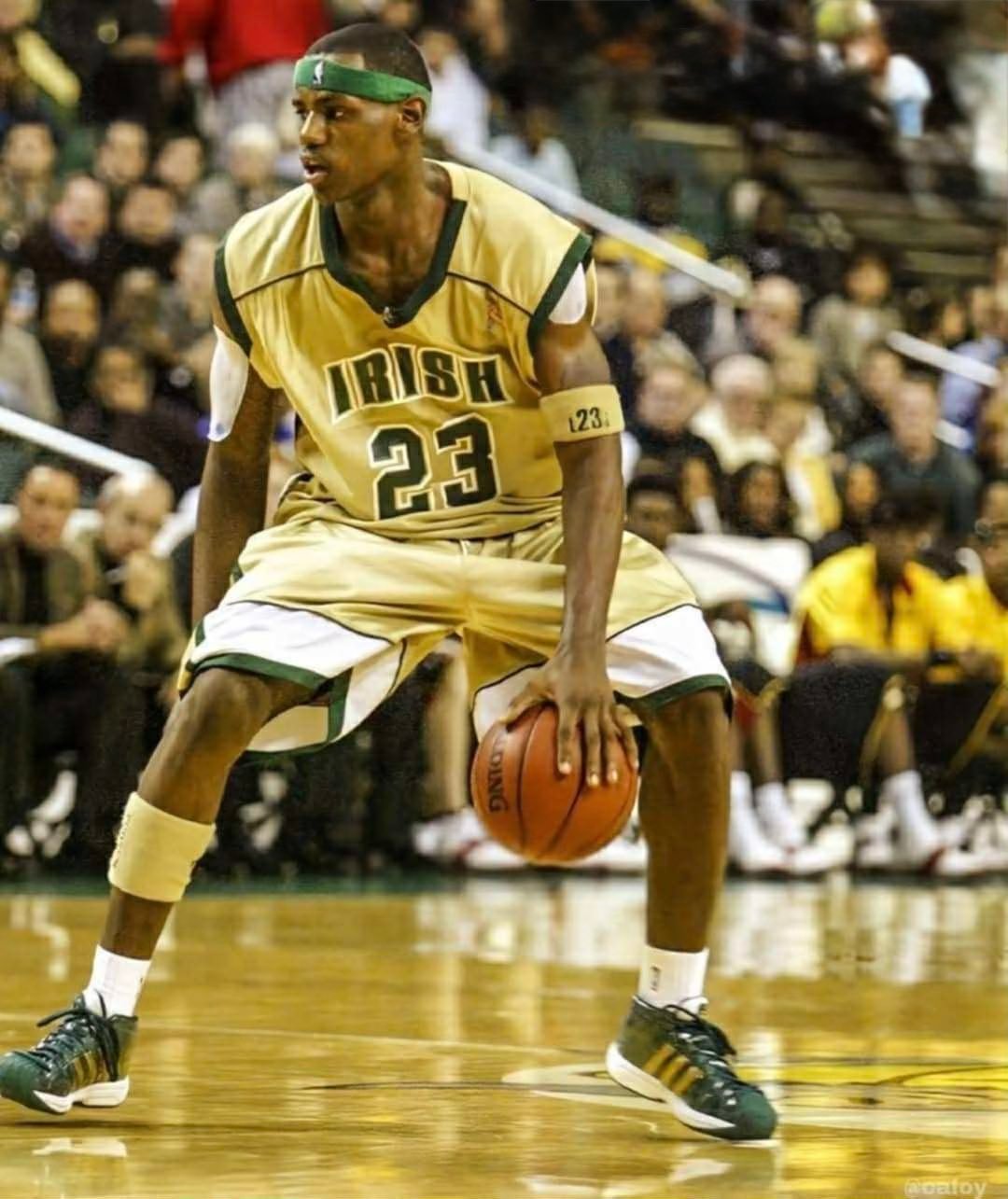 今天勇士主场对阵骑士,场边观战的库里上脚詹姆斯高中时期所穿的球鞋,圣文森特圣玛丽高中配色。