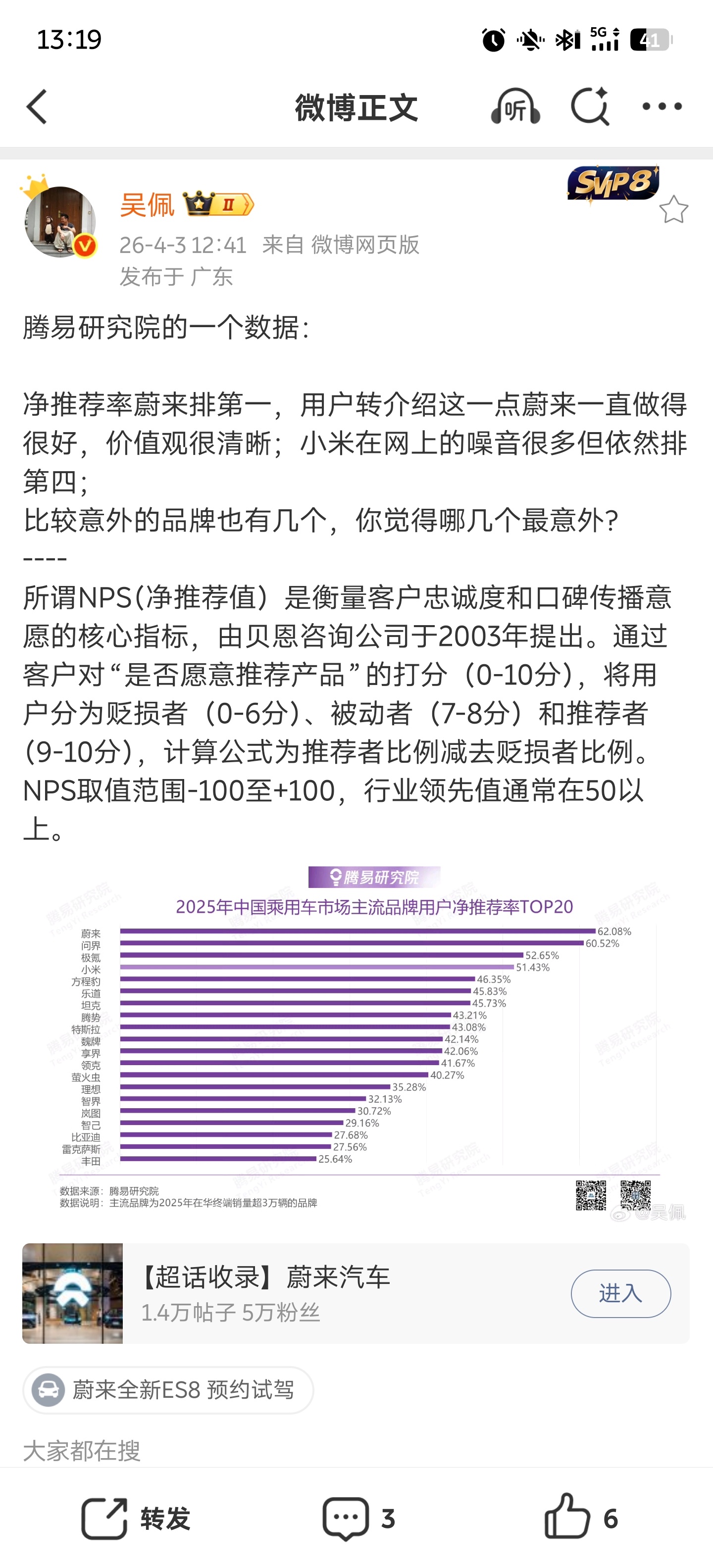 蔚来复购率和净推荐率确实一直很高,这个比例放在全球市场都是令人咋舌的。大v聊车