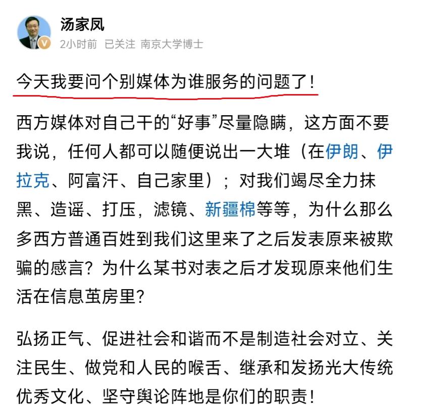 汤家凤今天再发文:今天我要问个别媒体为谁服务的问题了! 这个问题提得非常尖锐!他的观点也很明确:弘扬正气、促进社会和谐而不是制造社会对立、关注民生、做党和人民的喉舌、继承和发扬光大传统优秀文化、坚守舆论阵地是媒体的职责!他建议媒体应该走群众路线,真正走入基层百姓,多做调查研究! 过去的媒体,记者要跑基层、蹲现场,拿着本子一笔一笔记,一件一件核实,写出来的报道接地气、有温度,老百姓愿意信、愿意看。 不管是政策解读,还是社会新闻,目的都是让大家明白国家在做什么、身边发生了什么,遇到问题能有地方说、有渠道反映,最后把人心聚到一起,把社会风气往好的方向带。 这就是汤老师说的,弘扬正气、促进和谐,而不是反过来,把人往对立的方向引。 可现在呢?打开手机,各种信息铺天盖地,有些内容看着热闹,实则全是 “带节奏”。 就拿一些社会热点来说,明明是一件可以理性讨论、妥善解决的事,到了个别媒体手里,非要掐头去尾、放大细节,把小事炒大、把大事炒炸。 比如邻里纠纷、职场矛盾、不同群体的观念差异,本来都是生活里的正常现象,好好沟通就能化解。 但有些账号就爱揪着极端案例不放,故意渲染 “阶层对立”“群体矛盾”,把个别问题说成普遍现象,把局部矛盾夸大成全社会的问题。 他们这么做图什么?说白了就是图流量、图赚钱。 现在的舆论场,流量就等于收益,越极端、越对立、越能挑起情绪的内容,越容易被转发、被评论。 于是有人就钻了这个空子,放弃了调查核实的本分,放弃了客观理性的底线,专门盯着能煽动情绪的点做文章。 今天说这个群体不好,明天骂那个行业不对,把社会拆成一个个对立的阵营,让大家互相指责、互相猜忌。 时间久了,本该和谐的社会氛围,被搅得乌烟瘴气;本该理性的公共讨论,变成了骂战和对立,这完全违背了媒体该有的初心。 更让人担心的是,有些媒体早就脱离了群众,忘了 “从群众中来、到群众中去” 的根本。汤老师反复强调要走群众路线,真正走入基层,多做调查研究,这句话说到了点子上。 现在不少媒体,坐在办公室里编稿子、对着网络素材拼内容,根本不下去跑、不下去问。 老百姓真正关心的是什么?是柴米油盐的价格、是孩子上学的问题、是看病就医的便利、是找工作的难处、是养老的保障。 这些最实在、最接地气的民生事,才是群众最想听、最需要关注的内容。 可有些媒体偏偏不关注这些。要么整天追着明星八卦、花边新闻,把娱乐炒作当成主业;要么搞些空洞无物的口号式宣传,不接地气、不切实际,老百姓看了觉得离自己太远。 还有的干脆照搬网络二手信息,不核实、不调查,假消息、错信息满天飞。 久而久之,群众有心里话没地方说,有真问题没地方反映,想看的内容看不到,不想看的垃圾信息却躲不开,这样的媒体,怎么可能得到群众的信任?又怎么能称得上是为人民服务? 还有一个很关键的点,汤老师提到要继承和发扬优秀传统文化、坚守舆论阵地。这一点在当下尤其重要。 现在网络上各种思潮混杂,有些别有用心的人,借着 “言论自由” 的幌子,抹黑历史、诋毁英雄、否定传统文化,把西方一些极端、错误的价值观包装成 “新潮”“先进” 的东西,到处传播。 面对这些乱象,媒体本该站出来正本清源,讲好中国故事、弘扬正能量,守住我们的精神阵地。 但现实是,有些媒体在这方面是缺位的,甚至是随波逐流的。 面对抹黑英雄的言论,不反驳、不澄清;面对诋毁传统文化的声音,不引导、不纠正;反而跟着蹭热度、博眼球,把错误观点放大传播。 媒体不仅要传递信息,更要传递正确的价值观,告诉大家什么是对的、什么是错的,什么是值得尊重的、什么是必须反对的。 这不是 “说教”,而是媒体该担的责任,是守护社会共识、守护民族精神根脉的责任。 说到底,媒体为谁服务?答案从来都只有一个:为党和人民服务,为社会和谐服务,为公平正义服务学习强国。 这不是一句空话,而是要落到实实在在的行动上。