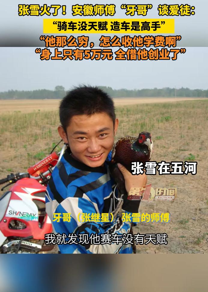 牙哥绝对是个人才,更是个好人。张雪能够遇到牙哥,真是运气太好了。 一个湖南卫视的那个记者,一个牙哥,一个张雪的妻子,三个都是张雪的贵人。 牙哥本身也是个人物,2007年就是全国冠军,一周的训练费5000元,当时也是高收入了。 2007年,普通人每个月的工资,也就是1500左右。 更重要的事,牙哥发现张雪赛车不行,没有天赋,但是修车可以。 这不是对张雪的否定,而是对张雪的点拨。事实证明,牙哥看的很准。