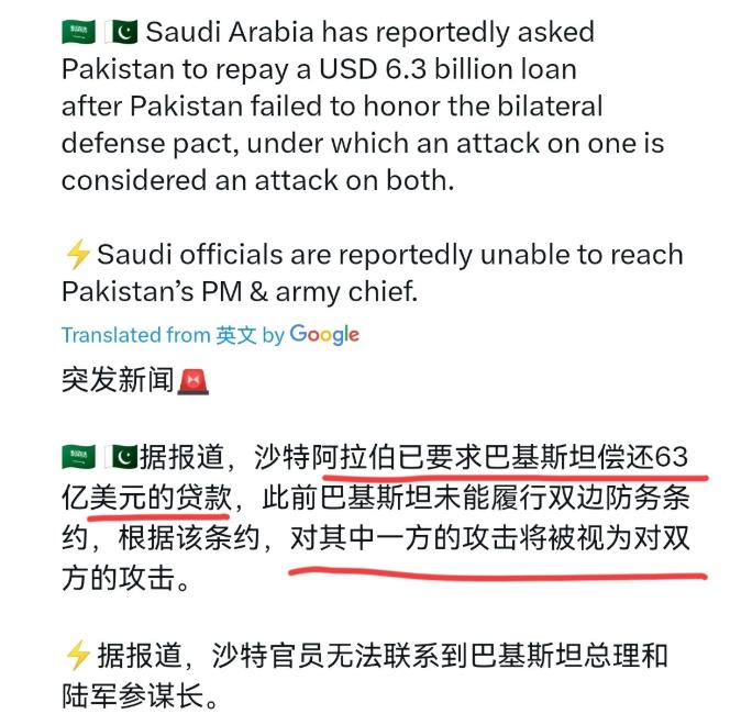 没想到巴基斯坦与沙特的关系会闹到这一步!沙特对巴基斯坦进行上门逼债! 4月3日,根据外媒报道,外媒称,沙特阿拉伯要求巴基斯坦偿还63亿美元的贷款。因为巴基斯坦未能履行双边防务协议,根据该协议,对一个国家的攻击被视为对两个国家的攻击。 说实话,确实没想到巴基斯坦与沙特的关系会闹到这一步田地。去年9月两国签了个《共同战略防御协议》,白纸黑字写着“对一国的攻击就是对两国的攻击”。结果呢?一场美以点燃的中东战争,就让两国的关系受到了如此巨大的考验。 沙特这些年没少给巴基斯坦掏钱。2018年就给了60亿美元援助,包括30亿美元存款和30亿美元延期付款的石油。到了2025-2026财年,沙特又提供了10亿美元石油融资,还把50亿美元存款给展期了。 这些钱对巴基斯坦来说就是救命钱,巴基斯坦经济一直不太好,还接受了国际货币基金组织70亿美元的贷款计划。可钱借多了总要还,沙特现在自己也缺钱,2026年要借578亿美元来补窟窿,这时候找巴基斯坦要账也就不奇怪了。 最让沙特上火的是那个防务协议。今年3月初,巴基斯坦外长达尔公开说,他已经提醒伊朗不要攻击沙特,因为巴沙之间有防务协议。这话听着是在帮沙特,可实际上是把沙特架在火上烤。 伊朗那边一听就不乐意了,你巴基斯坦什么意思?是想帮着沙特对付我吗?沙特这边也尴尬,本来想找个靠山,结果巴基斯坦这么一嚷嚷,反而让局势更紧张了。 到了3月中旬,沙特防长哈立德·本·萨勒曼紧急会见巴基斯坦陆军参谋长穆尼尔,专门讨论伊朗的导弹和无人机袭击问题。双方都说要在防务协议框架内制定具体措施,可明眼人都看得出来,沙特这是急了——我跟你签协议是让你保护我,不是让你到处宣传让我更危险的! 巴基斯坦也有自己的难处。国内有15%-20%的什叶派民众,这些人对伊朗有感情。真要跟伊朗撕破脸,国内就得乱。而且巴基斯坦和伊朗有900公里边境线,边境问题本来就复杂。 所以巴基斯坦只能玩平衡,一边跟沙特说好话,一边跟伊朗保证沙特不会用领土攻击伊朗。可这种两头讨好的把戏能玩多久?沙特那边已经有人说了,这可能是“最后一次试探”巴基斯坦,要是巴基斯坦不兑现承诺,两国关系就得完蛋。 巴基斯坦欠沙特那么多钱,拿什么还?今年1月就传出消息,两国在商量用“枭龙”战斗机抵债。这笔交易总价40亿美元,其中20亿美元用贷款抵扣。听起来是个办法,可问题又来了——美国能答应吗? 沙特一直是美国军火的大买家,特朗普上台后从沙特拿了上千亿美元订单。现在沙特要买中国和巴基斯坦联合研发的“枭龙”,美国肯定不乐意。所以这事谈了几个月也没个结果,双方都低调处理,不敢声张。 说到底,沙特和巴基斯坦这关系就像做生意——沙特出钱,巴基斯坦出安全保护。可生意做久了,账就算不清了。沙特觉得我给了你那么多钱,你该保护我的时候就得顶上;巴基斯坦觉得我国内一堆麻烦,你也不能逼太紧。再加上中东局势越来越乱,伊朗、以色列、美国都在搅和,这生意就更难做了。 现在沙特上门逼债,要巴基斯坦还63亿美元,表面上是钱的问题,实际上是对巴基斯坦在防务协议上表现不满。沙特心想,我借你钱是让你发展经济、稳定局势,好有能力保护我。结果你经济没搞好,保护我也没做到位,那我这钱不是白借了吗?巴基斯坦也委屈,我国内都顾不过来,哪还有精力管你那么多? 这事最后怎么收场?要么巴基斯坦硬着头皮还钱,可它哪来的钱?要么继续用军火抵债,可美国那边怎么交代?要么沙特再退一步,继续展期,可沙特自己也要借钱过日子了。看来这对“兄弟国家”的关系,还得在钱和安全的夹缝中继续折腾。