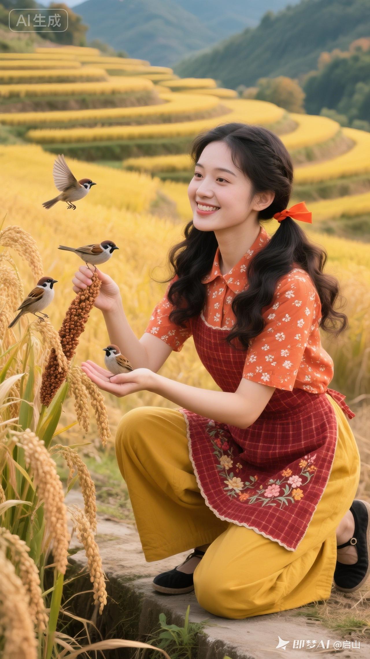 秋日田野里的少女与小鸟,温暖而宁静的乡村生活。