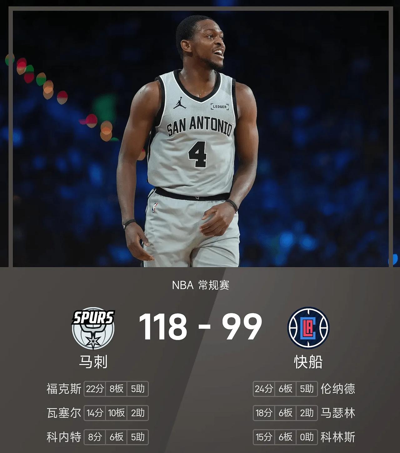 快船惨败马刺,伦纳德24+6+5+4记三分难救主!福克斯22+8+5,缺阵!文班亚马! 就在刚刚结束了一场NBA常规赛,快船主场惨败马刺,快船自从哈登乔治拉开之后,球队迎来大换血,仅仅留住当家球星伦纳德,球队已经不是夺冠热门球队了,目前快船39胜37负战绩跟开拓者持平,落后太阳2.5个胜场,不出意外快船有可能排名第8或者第9进入附加赛争夺, 马刺本赛季脱胎换骨,本赛季直接起飞,目前球队战绩逼近雷霆59胜18负,不出意外马刺本赛季再次拿到60胜球队,马刺拿到60升已经是伦纳德在马刺打球的时候,都是10几年前的事情,马刺阵容深度很强,年轻又有火力,完全不输于雷霆,已经是夺冠热门球队,当家球星文班亚马打出了本赛季场均得到24.7分11.5篮板3助攻3.1盖帽1抢断。文班亚马在MVP争夺中也有一席之地! 球员数据,马刺,福克斯22分8板5助3断、卡斯尔20分4板5助、哈珀19分2板5助、瓦塞尔14分10板2助、尚帕尼13分8板4助2断、凯尔登13分6板1助 快船,伦纳德24分6板5助2断、马瑟林18分6板2助2断、科林斯15分6板、米勒12分、加兰11分2板3助、