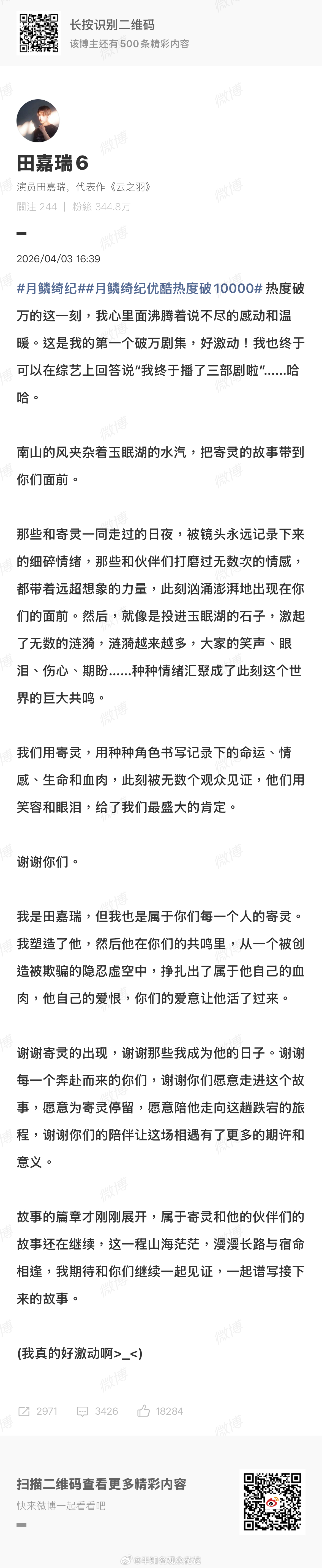 性情了田嘉瑞迫不及待跟粉丝分享还发了小作文田嘉瑞得知月鳞绮纪破万的反应田嘉瑞大喊破万啦