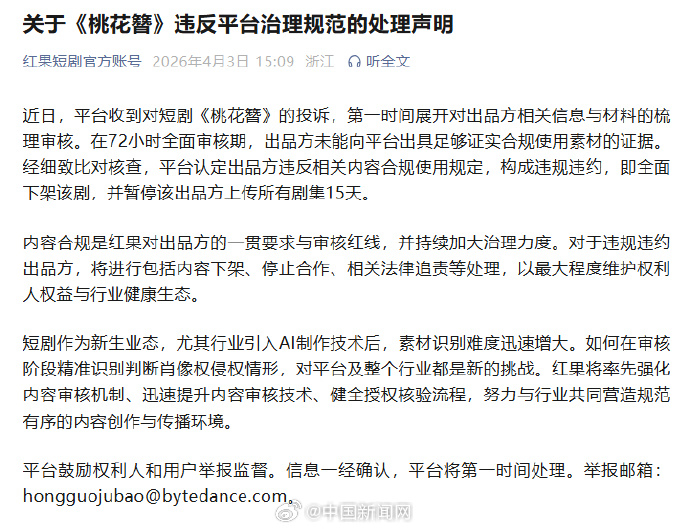 【短剧桃花簪被下架】红果短剧发布声明:近日,平台收到对短剧《桃花簪》的投诉,第一时间展开对出品方相关信息与材料的梳理审核。在72小时全面审核期,出品方未能向平台出具足够证实合规使用素材的证据。经细致比对核查,平台认定出品方违反相关内容合规使用规定,构成违规违约,即全面下架该剧,并暂停该出品方上传所有剧集15天。