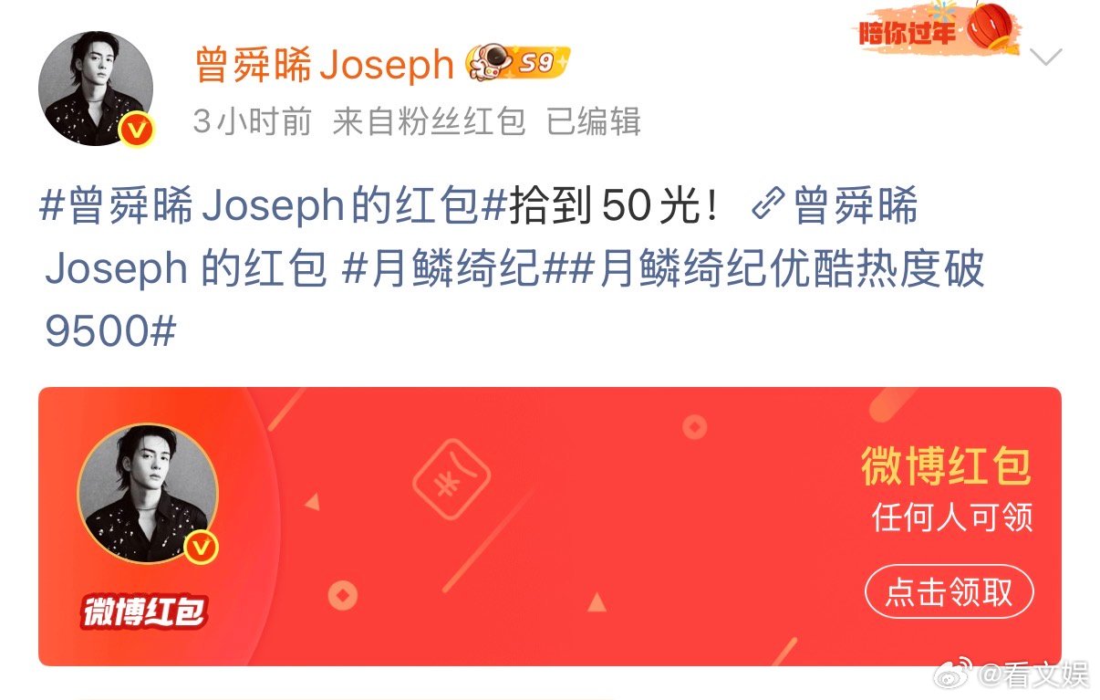 曾舜晞又发了3万红包 曾舜晞又发了3万红包,此男就是如此大方,好好好没抢到的我一点都不忮忌曾舜晞月鳞绮纪热度破10000红包