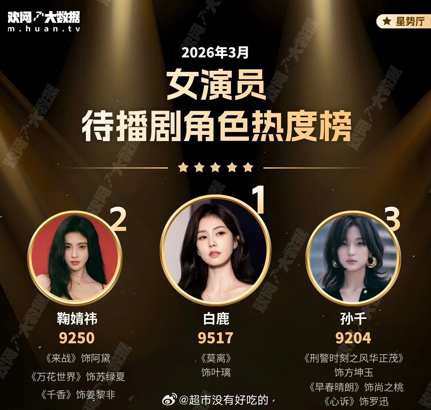 26年3月女演员待播剧角色热度榜恭喜白鹿角色热度登顶期待待播剧《莫离》叶璃早日见