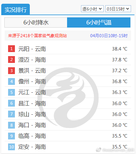 【高温】今天云南、海南部分站点出现高温。截至15时最高,云南元阳38.4℃,排名第一。云南景洪37.2℃创当地今年以来气温新高。